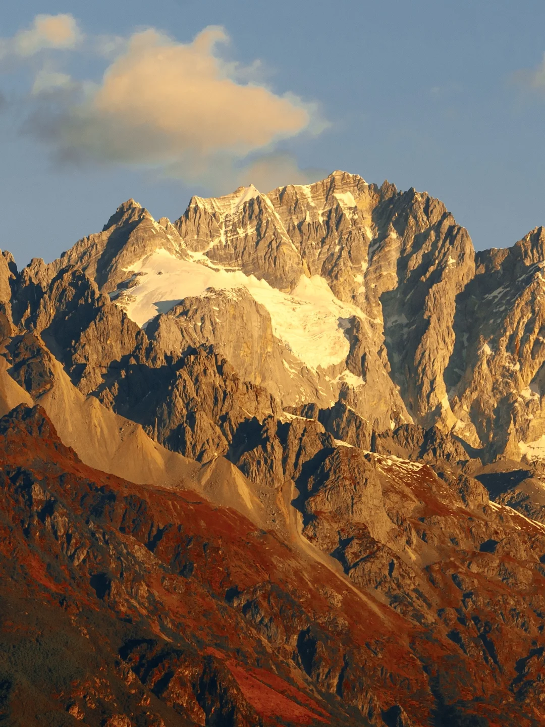 清晨的潭水静得像镜面,深蓝的天慢慢洇出橘粉与鎏金。第一缕阳光轻轻吻上扇子陡的峰尖,银白的雪巅瞬间染上蜜糖般的暖金,顺着山脊慢慢流淌,连古楼的飞檐都镀上了柔光,水中倒影成双,美得让人不敢大声呼吸。