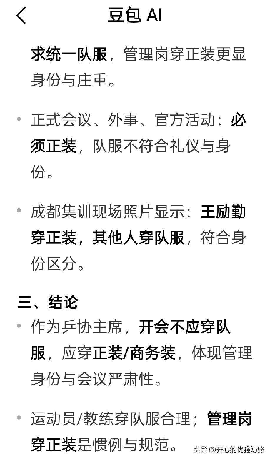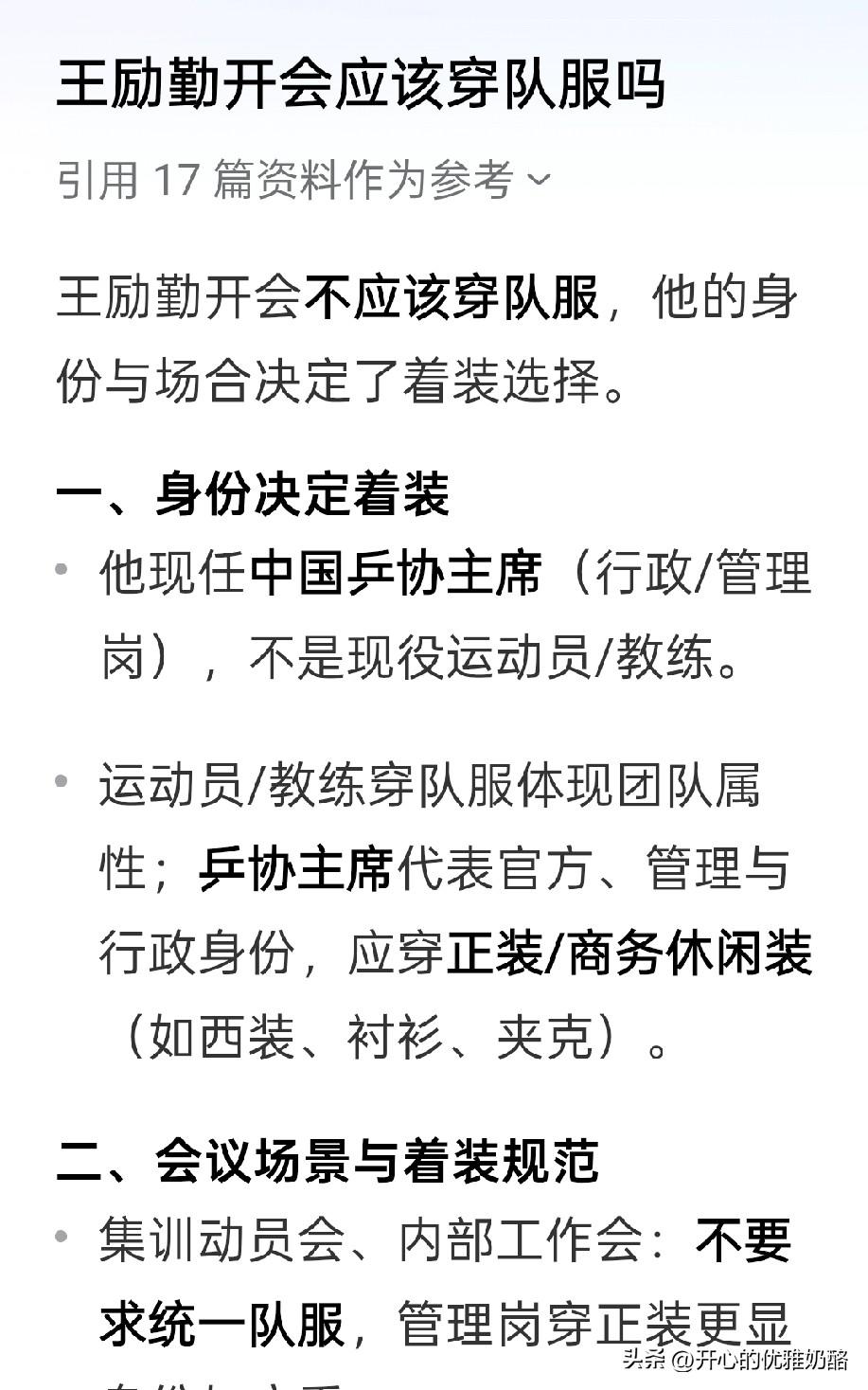 王励勤开会没穿队服,被说只突出个人。 感觉这个说法很好笑,看过班主任穿校服了吗? 然后又去问了豆包,豆包当然更专业。 说他不应该穿队服,因为他的身份决定穿着,适合穿正装或商务装。 一些人总拿现任和前任比,其实是没有可比性的,如果两个人都一样,那何必换人呢。 正因为突出集体,才让陈熠、石洵瑶、温瑞博都打出来了。 不然国乒断档严重,未来一定堪忧。 现在国乒的现状,不是一朝一夕的事,是梯队建设出现问题,王励勤敢于直面问题,大胆培养新人,这一点就必须支持。 图片来自网络侵权可删。