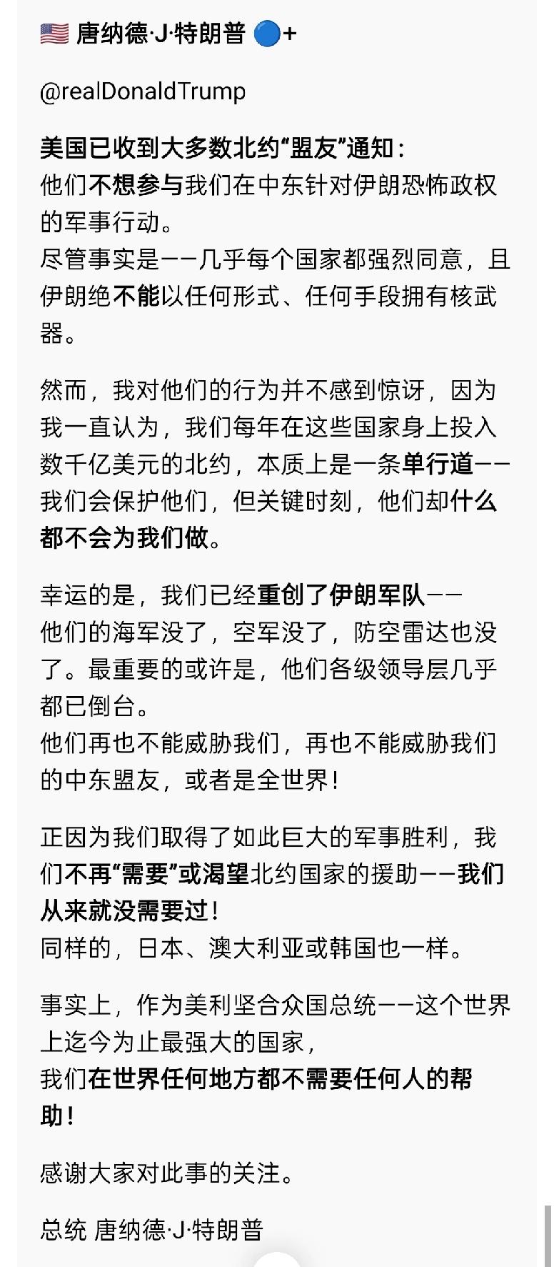 就在刚刚,特朗普给所有盟友发了“分手信”:美国不再需要北约及日、澳、韩帮助! 他称多数盟友不愿参与对伊军事行动,北约本质是一条“单行道”,美曾长期保护盟友却难获回报。不光是北约,日本、韩国和澳大利亚也一样。他还宣称美军已“重创”伊朗军事力量,无需任何人协助 。 如今,盟友对“分手信”反应冷淡。欧盟直言“不是欧洲的战争”,无意扩大护航行动;日韩、澳大利亚暂未回应 。 霸权之下,盟友已然离心,美国的孤立之路已开启,彻底成了孤家寡人。 网友评论很扎心:“小弟们发现老大连自己都保护不了,还敢收保护费”;“像幼儿园过家家,动不动说‘再也不理你了’”……