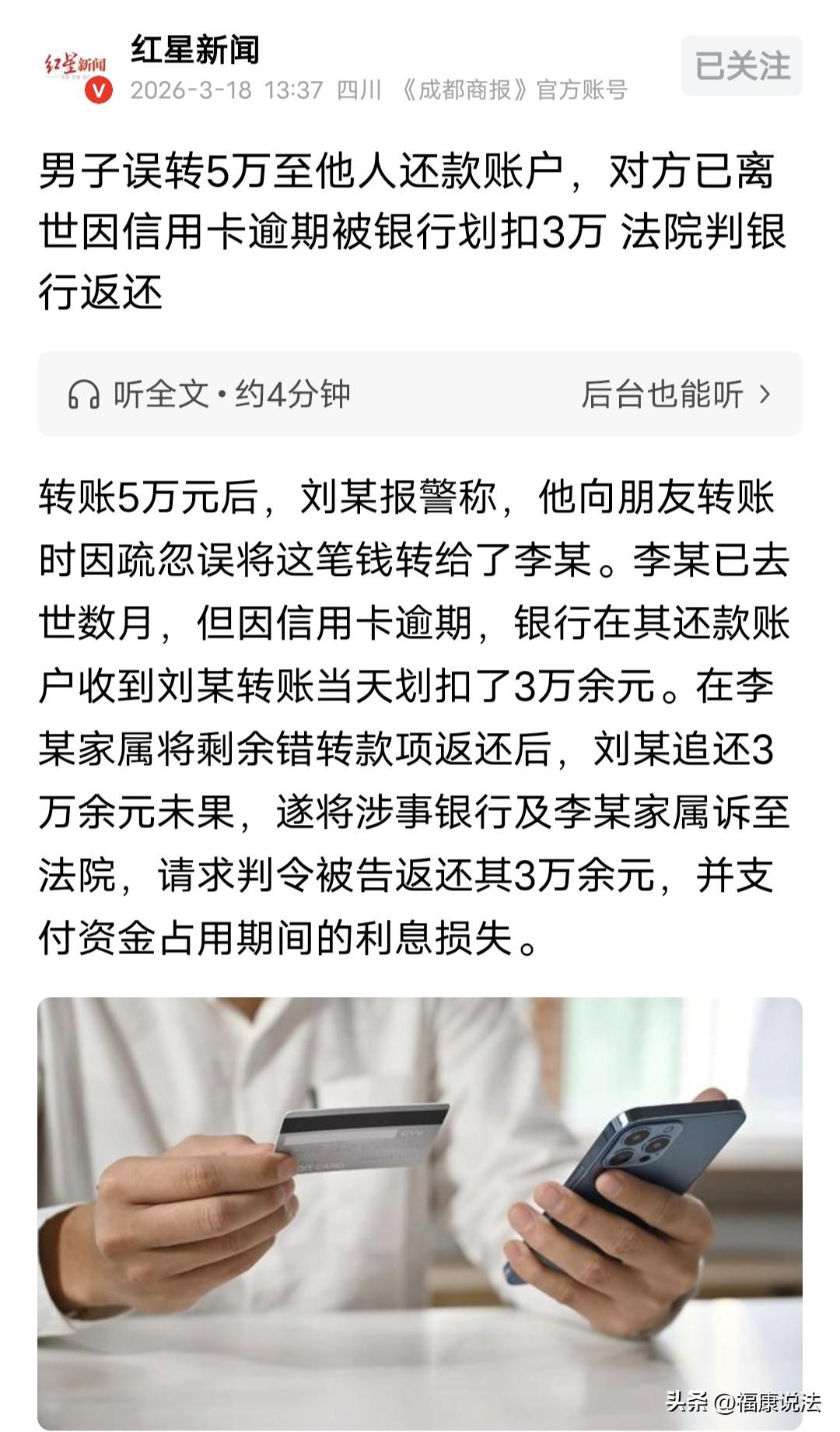 河南许昌,男子给朋友转账,手一滑,把5万元转给一已去世的老人信用卡里,谁料,老人信用卡逾期,银行直接划扣走3万多,男子发现后急忙报警,老人家属把剩余的钱还给男子,可男子要不回被划扣的3万余元,他只好把银行和老人家属告上法院,法院判决亮了! 刘某这辈子都没想到,自己转个账,一个手滑,能闹出这么一场离谱又闹心的事。 2025年8月10下午,5点半左右,刘某本来想给朋友李某甲转5万块钱,他盯着手机银行输账号的时候,只看了一眼“李”眼睛一花、手指一哆嗦,直接把钱转到了一个叫老李的人账户里。 等转完账,朋友李某甲说没收到钱,刘某再一看转账那方的收款名,当场就懵了——这个老李,他根本不认识。 刘某惊慌失措,五万块钱啊,可不是小数目,他吓得急忙报警。 而后,让刘某惊讶的是,老李早在几个月前就已经去世了! 自己的5万块钱,居然阴差阳错打进了一个逝者的银行账户里,老刘吓出一身冷汗,只想着快点把钱追回来。 可令他没想到的是,更糟心的还在后面,老李生前办过信用卡,一直逾期没还,他这个账户正好是信用卡还款账户。 银行那边可不管账户主人在不在世,一看到有钱进账,当天就麻利地划走了30683.29元,用来抵了老李的信用卡欠款。 等刘某反应过来,5万块钱已经被银行扣走了三万多,剩下的一万多。 不过,老李的家属也算讲究,赶紧把剩下的钱退给了刘某。 可那被扣走的三万多,刘某怎么都要不回来了,这给他愁的吃不下饭,睡不好觉。 银行觉得,这钱进了老李的账户,就是老李的钱,扣信用卡欠款天经地义,凭啥退? 老李家属觉得,剩下的钱都还给了刘某,这事跟自己无关了。 刘某越想越委屈,这钱是我手滑转错的,一分钱都不是老李的,他都去世了,跟我半毛钱经济纠纷都没有,银行凭啥拿我的钱去抵债? 跟银行沟通无果后,老刘直接把银行和老李的家属一起告上了法院,非要讨回这三万多块钱。 法院查明:老李4月份就去世了,老刘8月份才转错5万块,俩人压根没有任何金钱往来,因此,这5万就是误转。 老李的家属也很无辜,只拿到了剩下的钱,早就全额退还,没占一点便宜。 而银行这边,虽然不是故意扣错钱,但这笔钱的的确确是刘某误转的,不是老李的合法财产。 最终,一审法院判决:银行必须把扣走的30683.29元还给刘某,利息就不用赔了。 银行不服气,觉得自己扣欠款没错,又提起了上诉。 从法律角度来说,刘某误转的5万块,李某家属和银行都没合法理由拿这笔钱。 《民法典》第122条规定:因他人没有法律根据,取得不当利益,受损失的人有权请求其返还不当利益。 李某去世了,他的遗产,其母亲已经放弃继承,遗产由妻子合法继承,那么,李某欠的钱,就应该由继承遗产的妻子来还,但他没道理继承这笔错转的钱。 银行划扣信用卡欠款也得是基于合法债务,可这钱是刘某误转的,银行划扣就没合法依据,所以,刘某有权要回这笔钱。 最终,二审法院一查,事实清清楚楚,直接驳回了银行的上诉,维持原判! 折腾了这么久,刘某终于拿回了属于自己的钱,这场离谱的转错账风波,才算彻底画上句号。 刘某误转钱肯定着急,银行在没搞清楚钱来源的情况下就划扣,确实有点不妥。 虽说银行是为了收信用卡欠款,但也不能随便划扣账户里的钱。 李某家属在知道是错转钱后,能把剩余钱返还,还算比较明事理。 银行作为专业的金融机构,处理事情应该更严谨细致,不能只看表面。 这事儿也提醒大家转账时一定要仔细核对信息,避免类似的麻烦。
