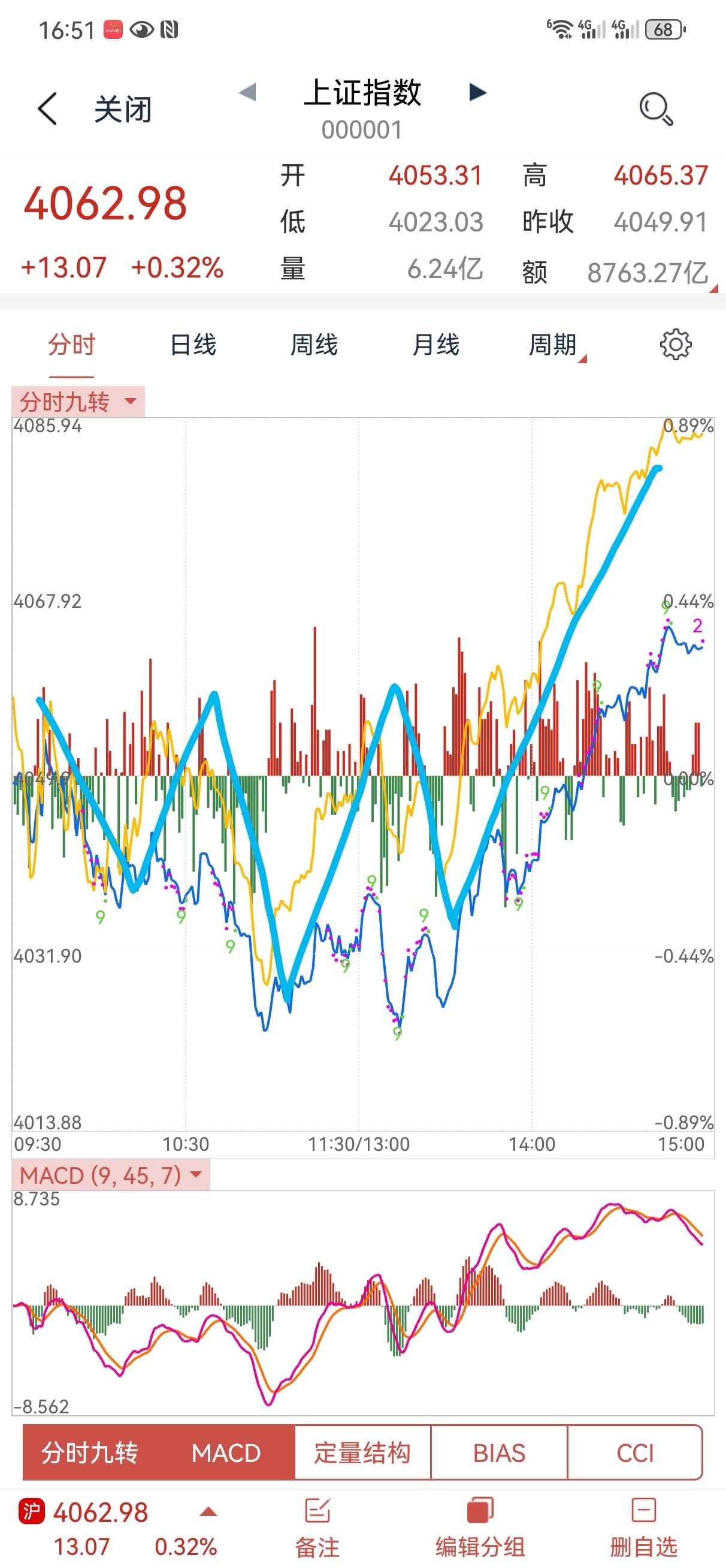 3月19日操盘笔记: 中午写了一篇关于量化的,结果不让发。其实让不让发,有些东西也掩盖不了,很多股民对于量化交易频率,机构可以轻松融券等问题都有异议,A股牛短熊长的原因难道跟一些交易制度的不合理,一些交易规则的不公平,不对等没关系吗?再展开说又毙掉了,就说这么多吧,大家都明白。 昨天我说了,量化交易在单边市里是没什么优势的,但是在这种跌宕起伏,死去活来的走势里是无敌的,它的优势散户根本难以望其项背,看看今天一天的分时线图就知道,一个交易日可以来回收割多少次。 今天上午的下跌最低到了4023点,距离最高点下跌了170点,我的预期是150点,当然不可能那么精准,不管是上涨还是下跌都会有一定惯性,目前来看还是在可控范围内。我认为大盘没有连续大跌的基础,这轮调整不是以空间为主的调整,大概率还是反复震荡洗盘的走势,所以我觉得没必要过于担心,也没必要危言耸听,本来我就认为是调整周期,对于轻仓等待的朋友来说,按照计划耐心等待即可。截止目前,我认为大部分的空间已经释放了,尽管并没有反转信号,但是也没有继续大幅杀跌的迹象,本来判断昨天应该反弹,直到今天下午才有点反弹的势头,有些时候不需要纠结,也没办法做到精准,大方向上别犯错误就是最好的操作。 明日操作计划:继续等待,先看看反弹力度!