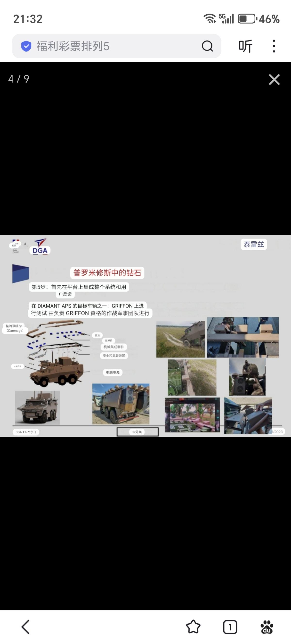 法国武装部证实未来可能会给“勒克莱尔”主战坦克安装法国国产的“硬杀伤/软杀伤防护装置”,到目前为止,"勒克莱尔"坦克的现代化升级(XLR标准)并未计划集成主动防护系统相关组件所谓“软杀伤”(soft kill)系统,旨在通过手段阻止敌方进行精确打击或目标锁定,例如使用烟幕弹或电子干扰设备。而“硬杀伤”(hard kill)系统,则是在来袭弹药(导弹、火箭弹、炮弹)命中装甲目标之前将其摧毁。 【图2】“增强型主战坦克 ”(EMBT)样车在“140毫米主炮先进演示炮塔"(ADT 140)无人炮塔上安装了主动防御系统 【图3】类似装置早在2000年代就曾开展过研究。当时,泰雷兹集团与德国 IBD公司联合开发的“硬杀伤系统”(SHARK),在一辆VAB装甲车上进行了测试,但是并未投入使用。 2022年法国陆军曾表示希望为“勒克莱尔”坦克以及“蝎子”(SCORPION)系列装甲车辆配备主动防护系统。从目前情况来看,这一目标似乎已经获得推进。 【图4至图9】法国武装部提到的国产方案,很可能指的是当前在“国防技术项目(PTD)‘普罗米修斯’”(全称“统一多效陆上防护系统”)框架下开发的系统。该项目由泰雷兹集团和 KNDS法国 承担,目标是开发一种综合防护体系,涵盖三类技术: 多用途被动防护 反应装甲防护 主动防护 2023年,法国军备总局(DGA)曾表示,已在一辆“狮鹫”装甲车上测试了“钻石”主动防护系统。但此后未再公布更多相关进展。 “钻石”采用了分布式硬杀系统配置,集成了四个频率调制连续波(FMCW)雷达传感器,安装在车辆的角落上。这个设置由车辆周围的效应模块补充,增强了其防御能力。根据法军的要求,该系统必须保证对带有单一聚能装药的火箭和导弹的探测和摧毁概率为 90%,对配备串联装药的导弹的探测和摧毁概率为 75%,360° 保护覆盖,包括高攻击角度威胁,附带损害极低(目标是“无”),其发射的雷达波具备非常低的可检测率(对车辆可检测性没有影响)。 与早期版本不同,这个版本最大限度地减少了对光学传感器的依赖,确保即使在浓烟等恶劣环境条件下也能提高可靠性。该系统能够检测和跟踪潜在威胁,包括反坦克火箭(ATR)和反坦克制导导弹(ATGMs),利用其雷达传感器。一旦发现威胁,APS会激活合适的效应模块,发射对策措施来消除或削弱威胁对车辆被动装甲的破坏能力