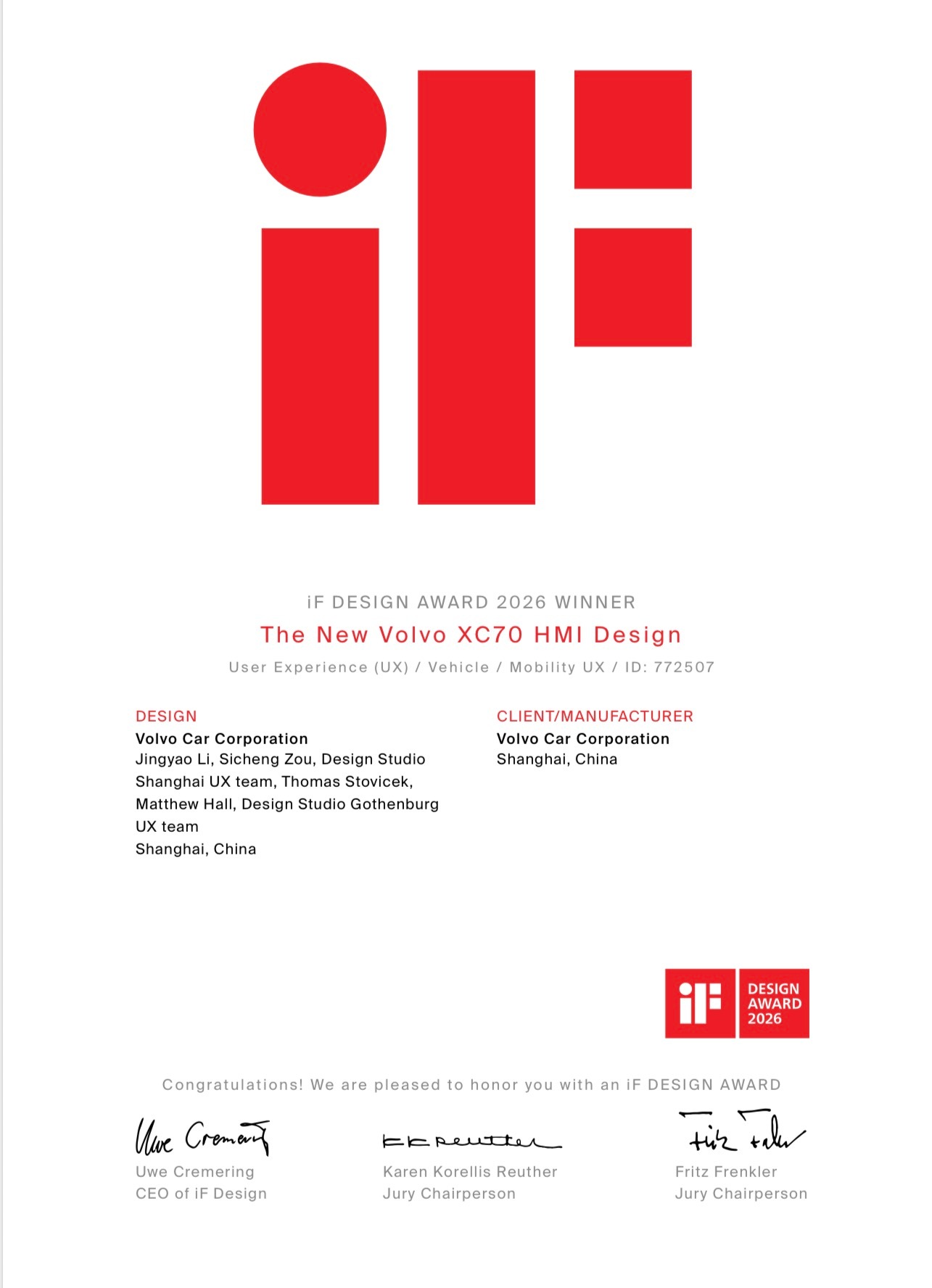 沃尔沃XC70获两项iF设计大奖在刚刚揭晓的2026年iF设计大奖评选中,沃尔沃全新XC70其整车设计与HMI设计一举获两项iF设计大奖。凭借卓越的产品实力,从全球66个国家/地区超11,000件参赛作品中脱颖而出。沃尔沃XC70通过斯堪的纳维亚设计美学、人性化智能科技与超混安全性能深度融合,生动诠释了“安全超混旗舰”独特魅力。