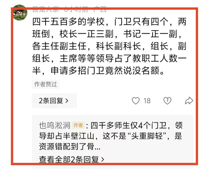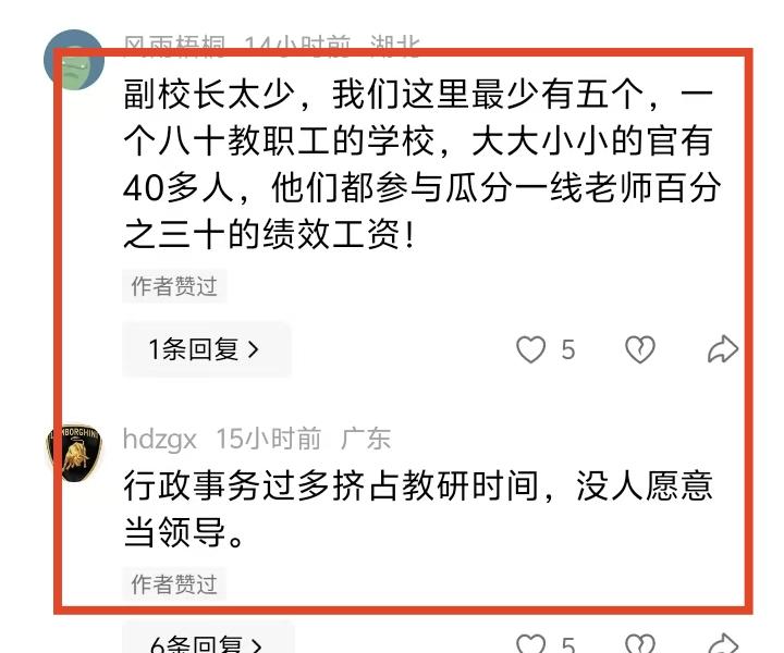 有网友发文吐槽,初中学校100多个老师,领导占了1/3,我觉得这个表格有一定夸张的成分,但中小学行政机构的臃肿却是不争的事实,中层干部和干事占的比例真的越来越大,这也让一线老师颇为诟病。 但其实也不要全怪学校,学校也很无奈,就这么多中层干部和干事,你去问他们,他们还觉得忙得要命,不够用。我们这里其实不少老师根本都不想当中层干部,宁肯当普通老师。 那么,为什么基层学校的行政机构越来越臃肿?原因其实真的很简单,你们去看一看基层教育局的规模,不少教育局占据了整整一栋楼,去数一数教育局有多少科室,他们要向基层学校发送多少任务,真的很可怕的。有的教育局编制可能只有30多个人,但从基层学校借调老师,总人数可能会接近百人。问题就来了,这些人人人都想把工作干好,都想干出点事情出来,所以得不断的搞活动分配任务,现在又是信息时代,鼠标轻轻一点,手指轻轻一拨,各种各样的任务雪片一样飞向学校,而且还有不少加急任务,让基层学校疲于奔命,苦不堪言。 我认识一个学校中层,他说每天早晨上班,最怕打开某些工作群,一打开就有任务,上午布置任务,下午就必须完成,像催命符一样。而且不少任务是重复上报的,没有什么用。 所以啊,教育要前进一大步,首先,机构要精简一大半。教育
