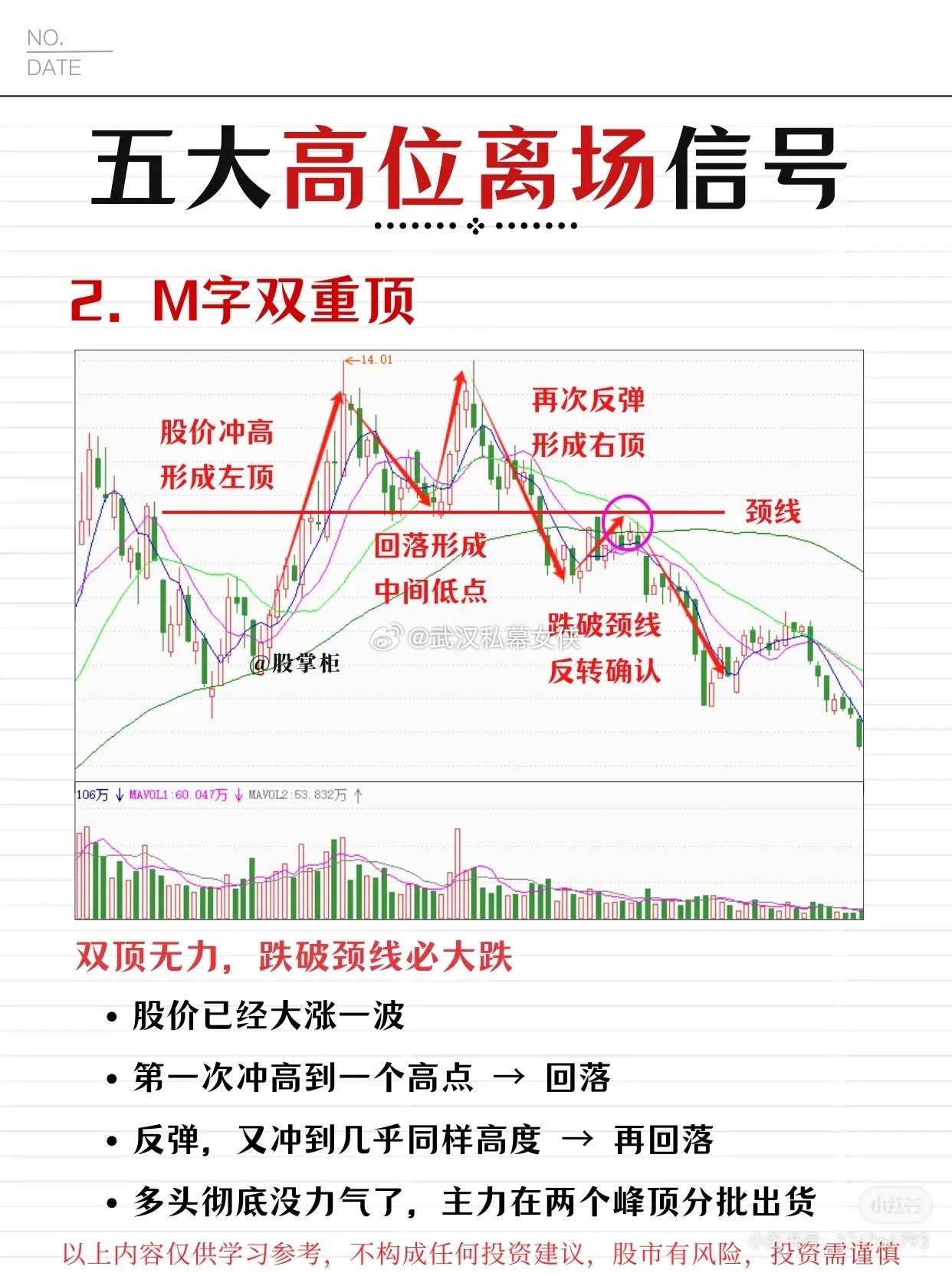 - 形态特征:股价先大涨一波,形成左顶(冲高回落)→ 反弹后再次冲高至相近高度形成右顶→ 两顶之间的回落低点为颈线。当股价跌破颈线时,形态确认。- 信号意义:多头力量耗尽,主力在双顶过程中分批出货,跌破颈线后往往伴随大幅下跌(“双顶无力,跌破颈线必大跌”)。