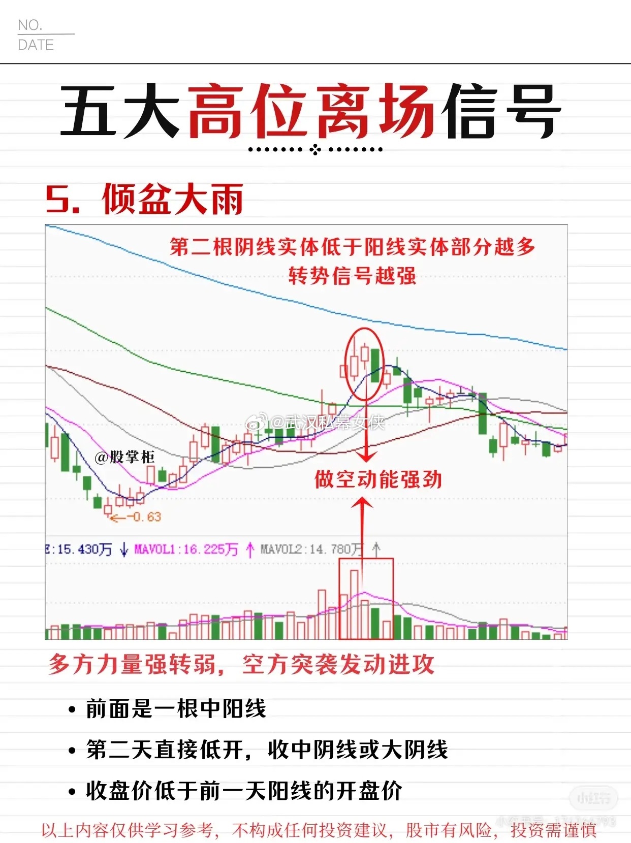 股票投资中五大高位离场信号,用于提示投资者在股价高位时及时卖出,规避下跌风险。以下是详细解读: