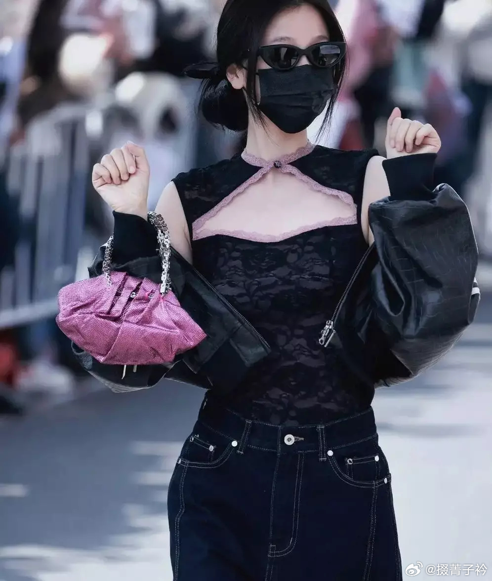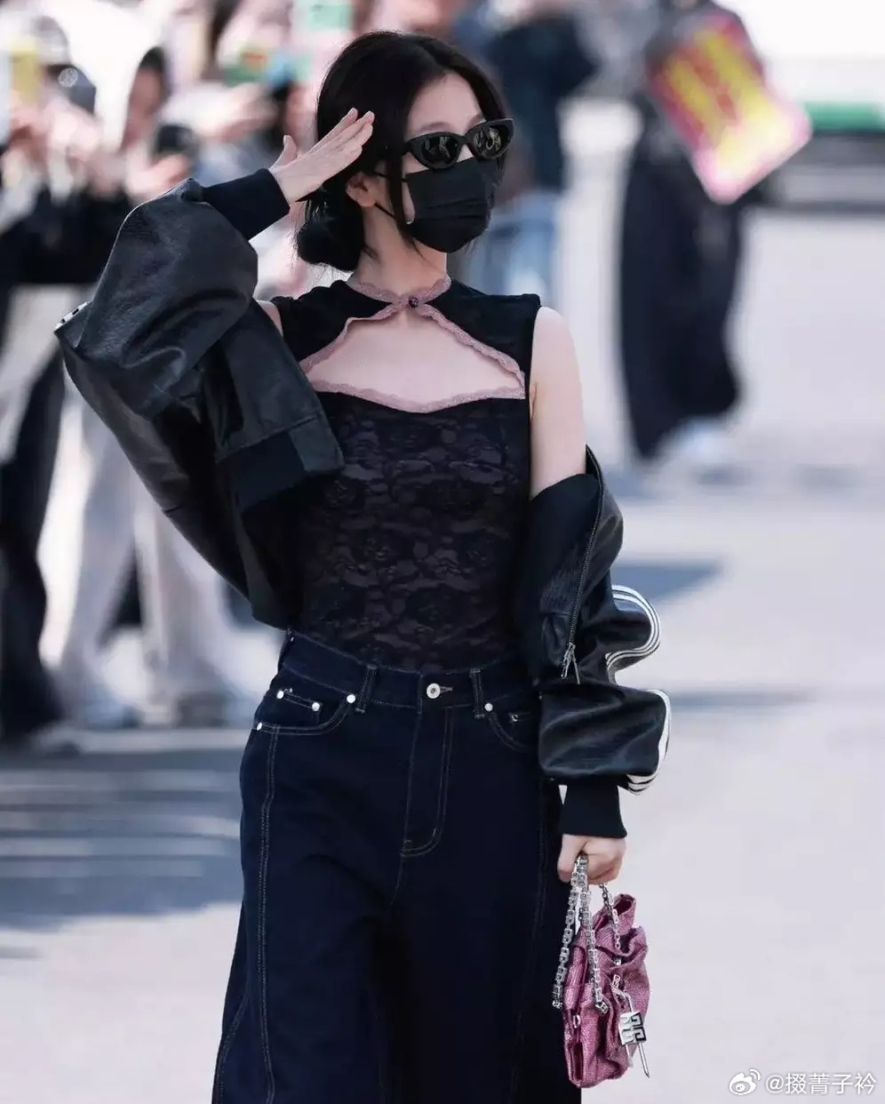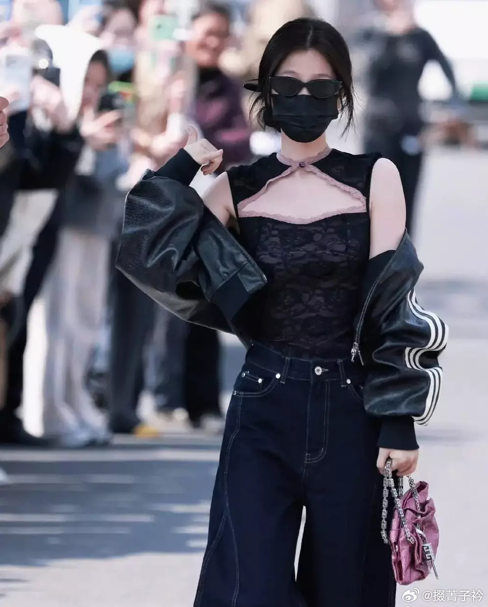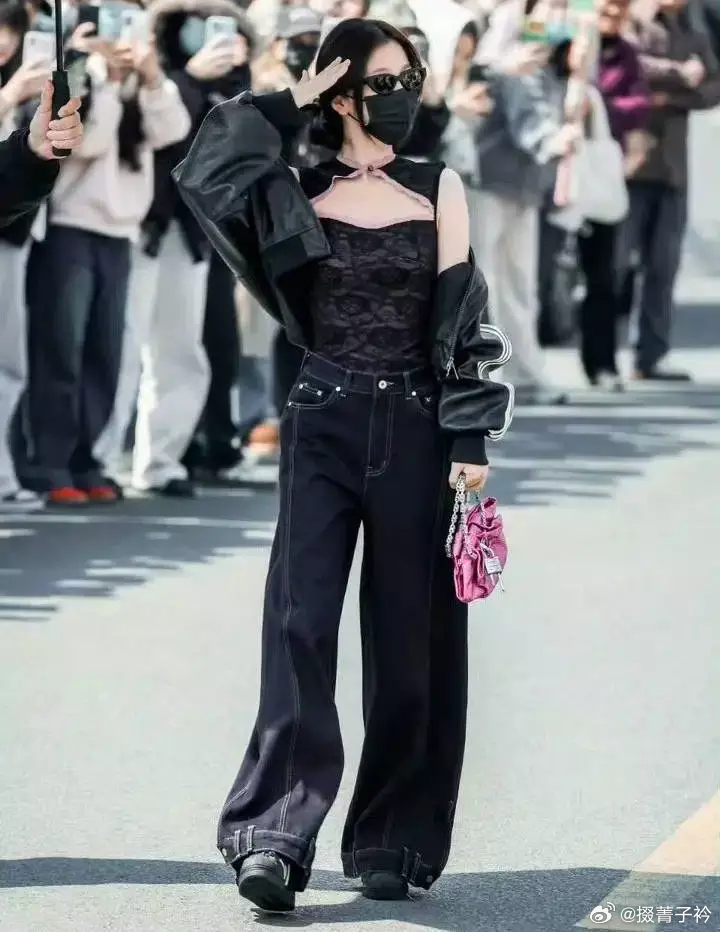 分享娱乐虞书欣穿黑蕾丝拼接上衣,外搭皮夹克,配阔腿牛仔裤,甜酷感十足。