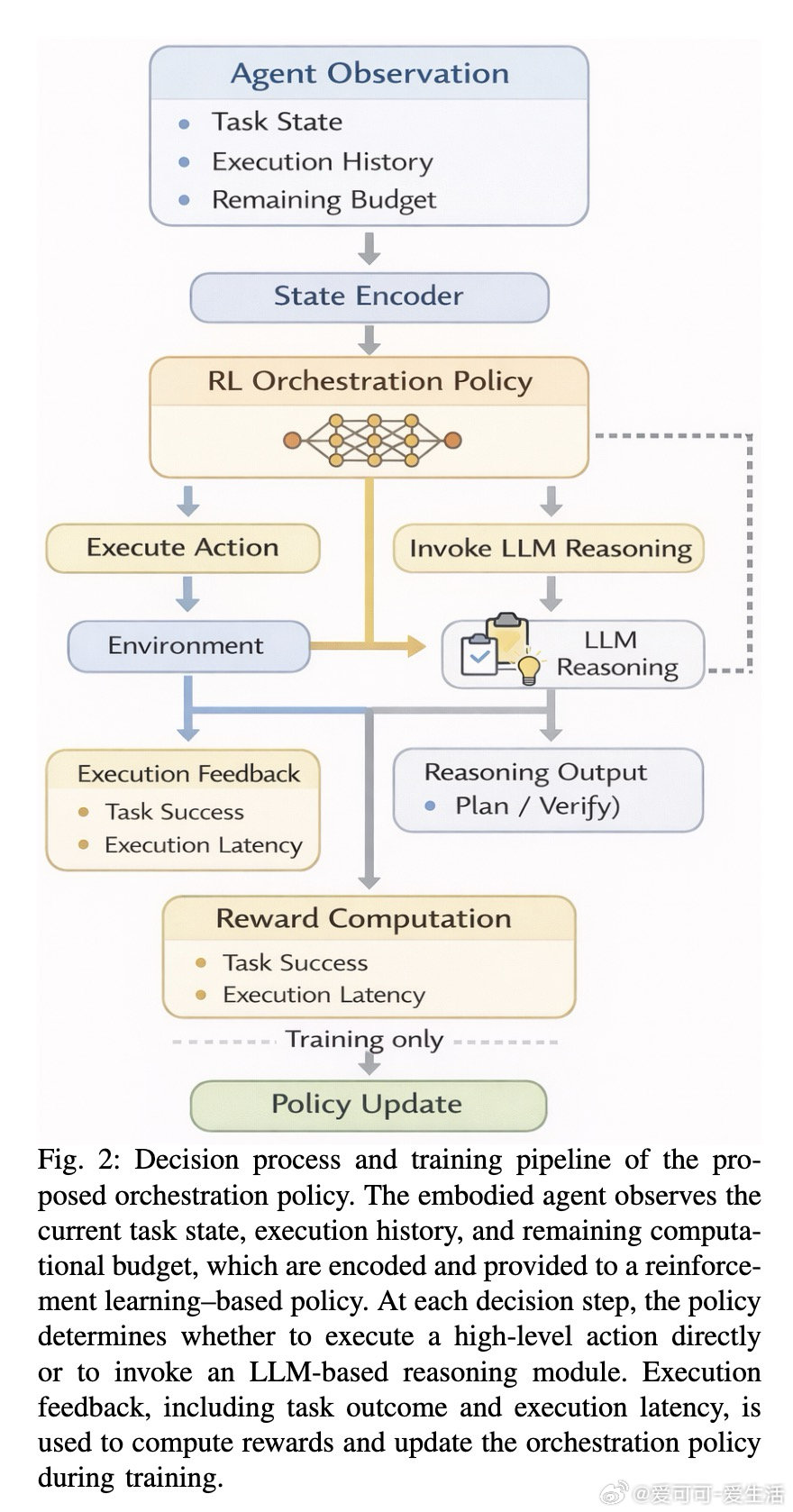 本文的核心洞见是:把"何时调用推理"重新看作一个可学习的编排决策,而非一条写死的规则。由此,一个RL策略被插入决策层,在每一步观察任务状态、执行历史与剩余算力后,选择"直接行动"还是"触发推理(规划or验证)"以及投入多少算力——这一关键操作使机器人得以在推理收益与延迟代价之间动态寻优,而无需触动底层控制逻辑。