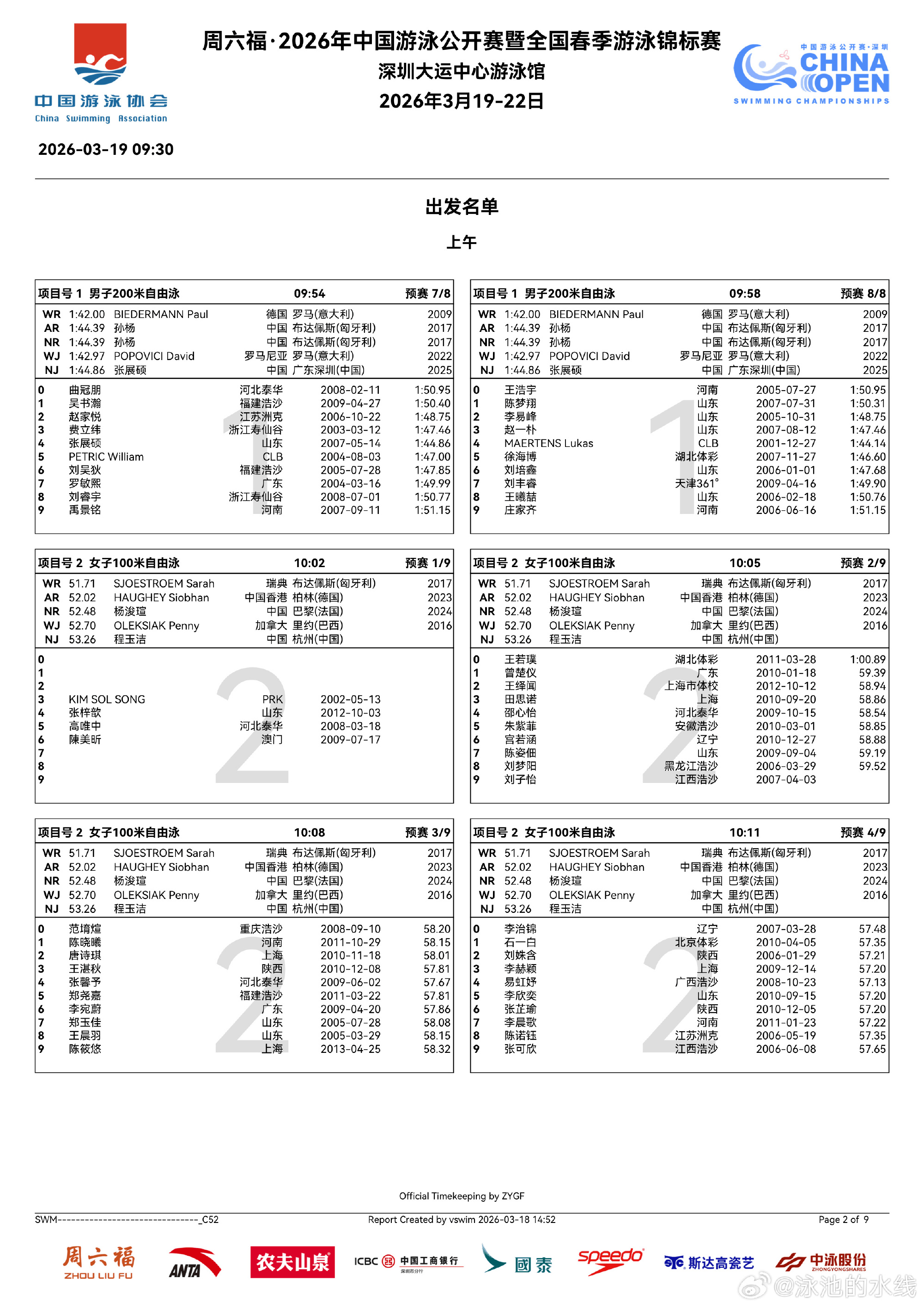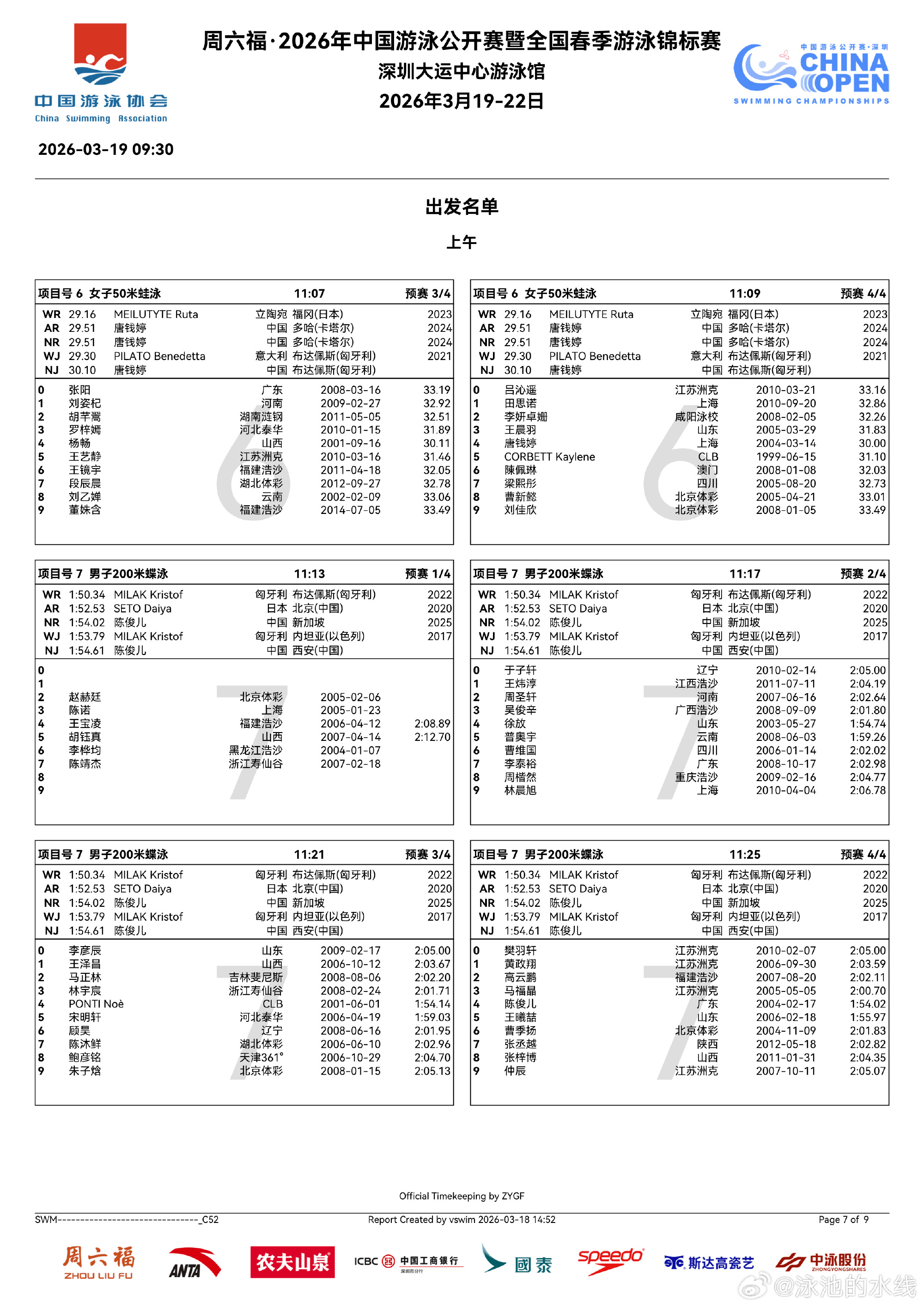 男子200米自由泳:潘展乐、张展硕、赵一朴、赵家悦、王浩宇、刘昊狄、费立纬、徐海博、王曦喆、刘绍鑫、何宇博、卢卡斯-马滕斯、威廉-佩特里奇;