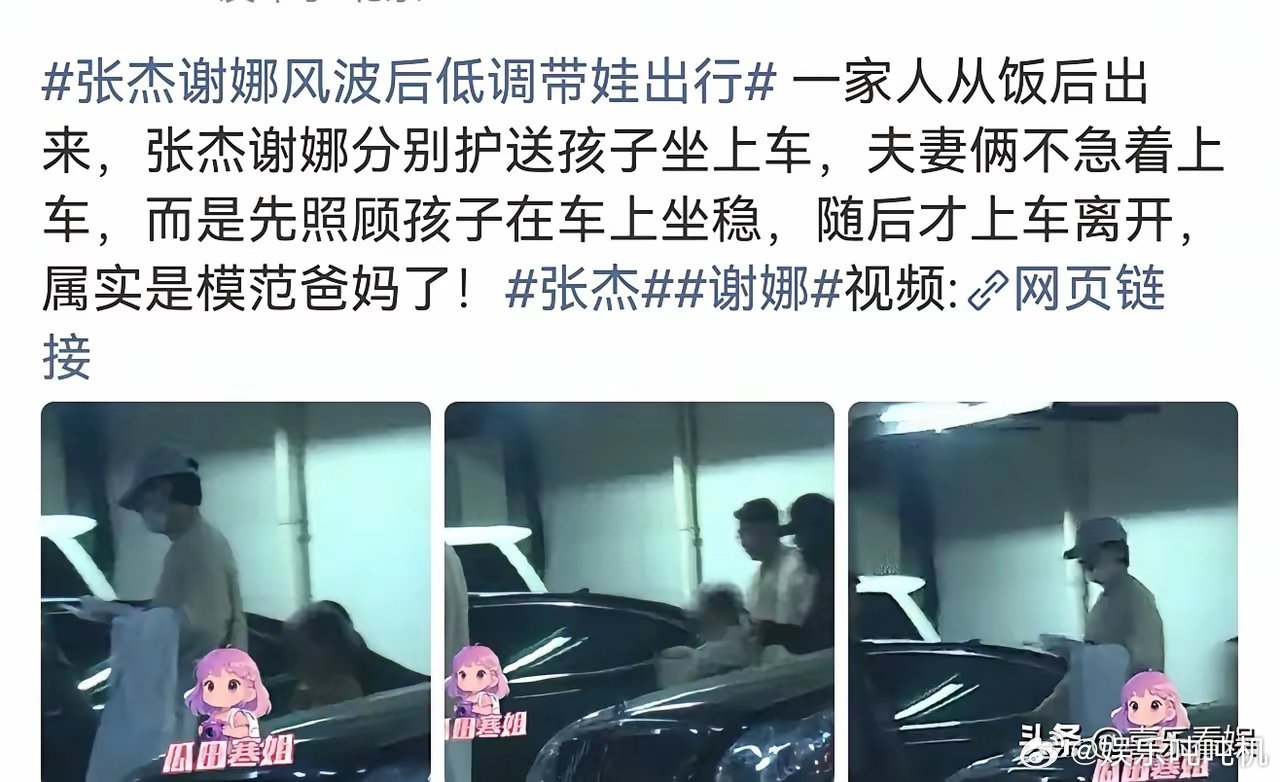 张杰谢娜,冲上热搜3月18日,张杰谢娜又冲上了热搜!这次不是因为回应什么事,而是有媒体拍到夫妻俩饭后带着孩子去车库的画面,引起了关注。视频里,张杰戴着帽子口罩,裹得严严实实,他先把孩子护到车边,谢娜也在旁边搭手,俩人分工特别默契。他们都不急着自己上车,先把孩子稳稳送进车里安顿好,确认孩子坐舒服了,才各自上车离开,动作轻手轻脚的,全是对孩子的细心。虽然画面有点糊,但能看出来俩人全程都在顾着孩子,完全没管旁边拍的镜头,这种低调护娃的样子,真的就是普通爸妈的模样,难怪大家都夸他俩是模范爸妈。网友看了也感慨:“不管外面怎么闹,把孩子放在第一位就赢了”,还有人说“这才是过日子的样子,踏实又暖心”。谢娜和张杰是2011年结婚,婚后有了三个可爱的女儿,夫妻俩至今携手走过十多年了,感情还是恩爱如初,祝福他们一直和和美美,幸福下去。