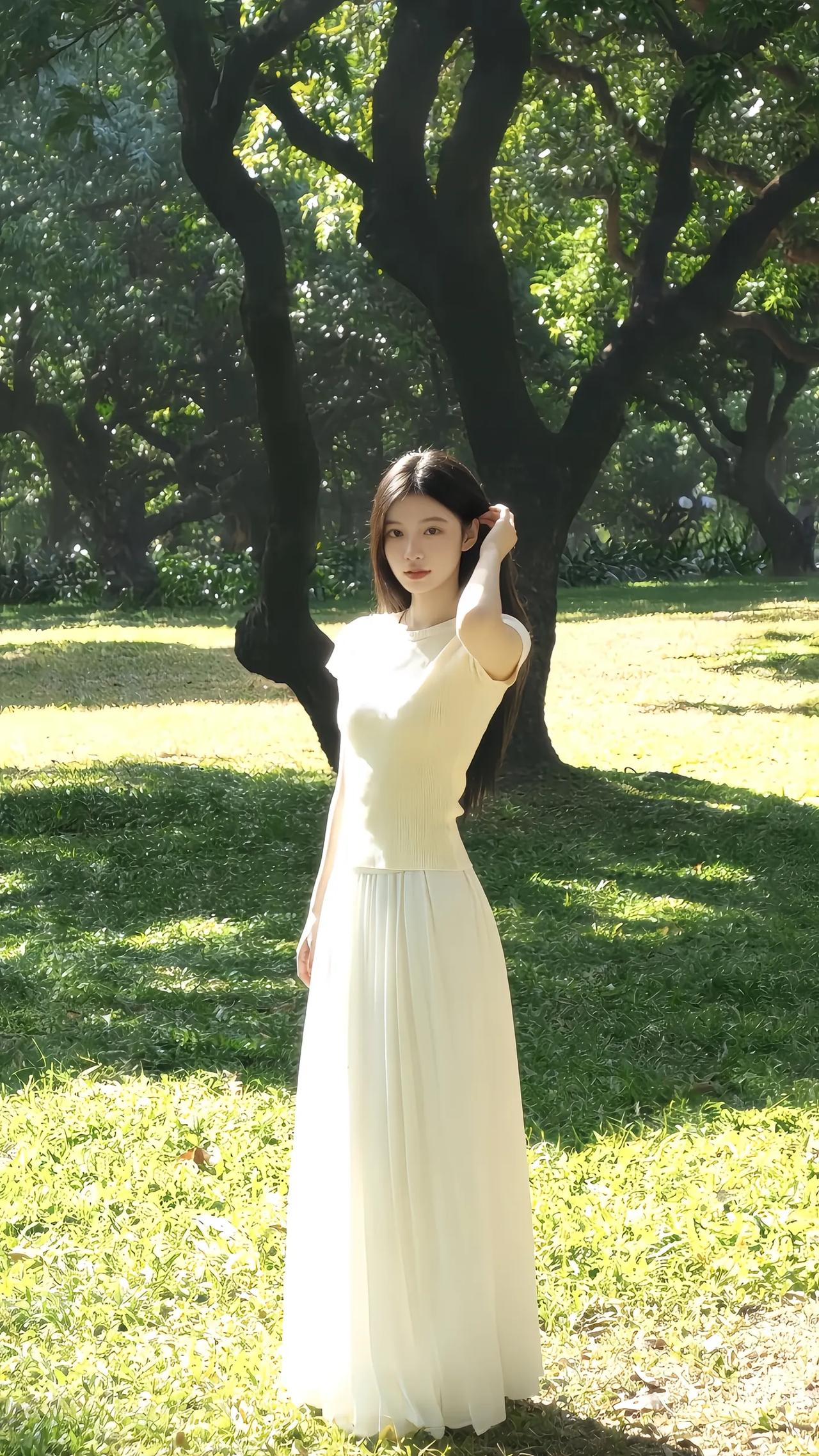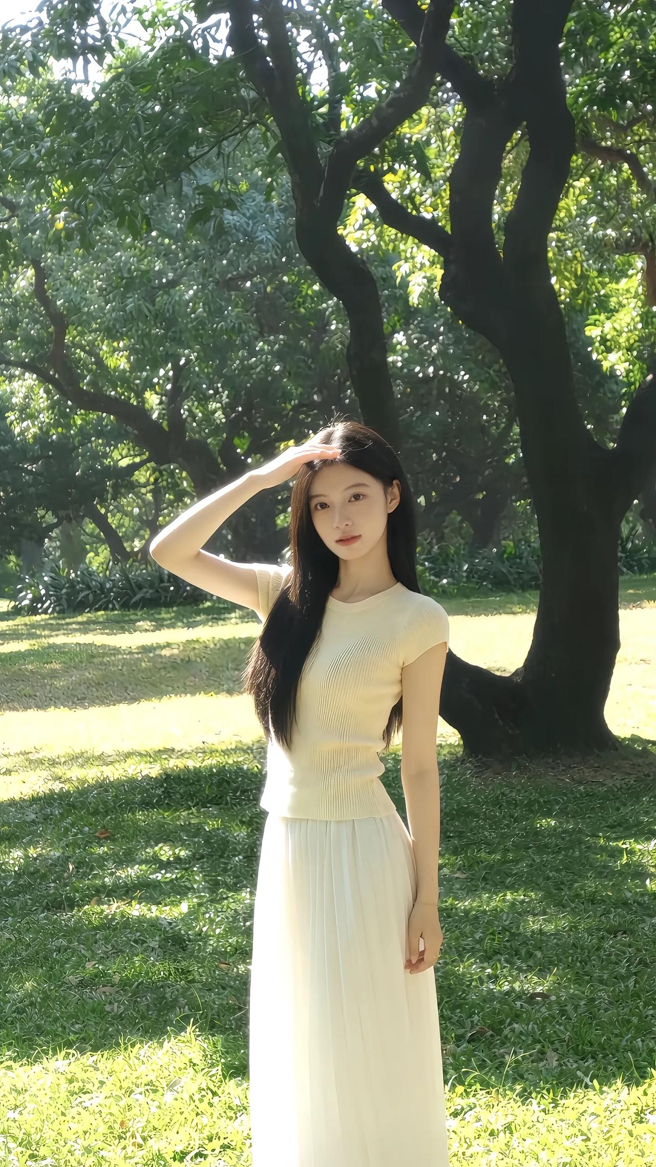 林间倚树思悠长,白衣飘飘意自闲。
