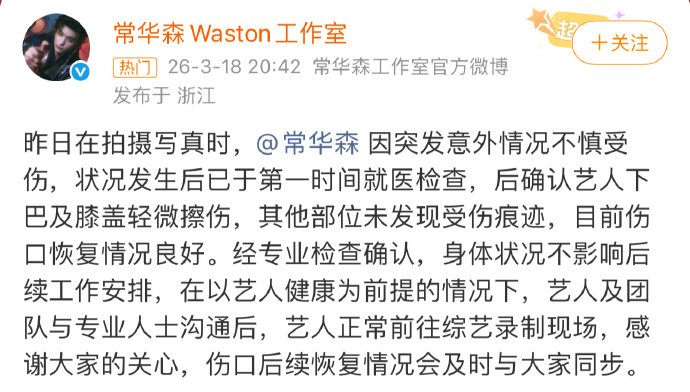 常华森表演后空翻摔到下巴 原来常华森的 “后空翻” 是这样翻的!拍写真时意外磕到下巴和膝盖,现在伤口恢复良好,还能正常录综艺,这敬业度拉满了!
