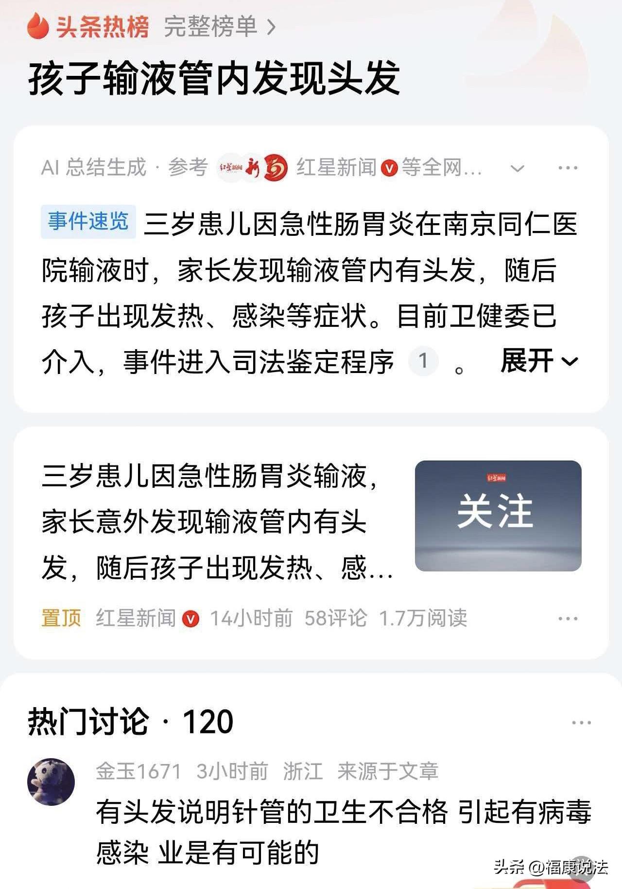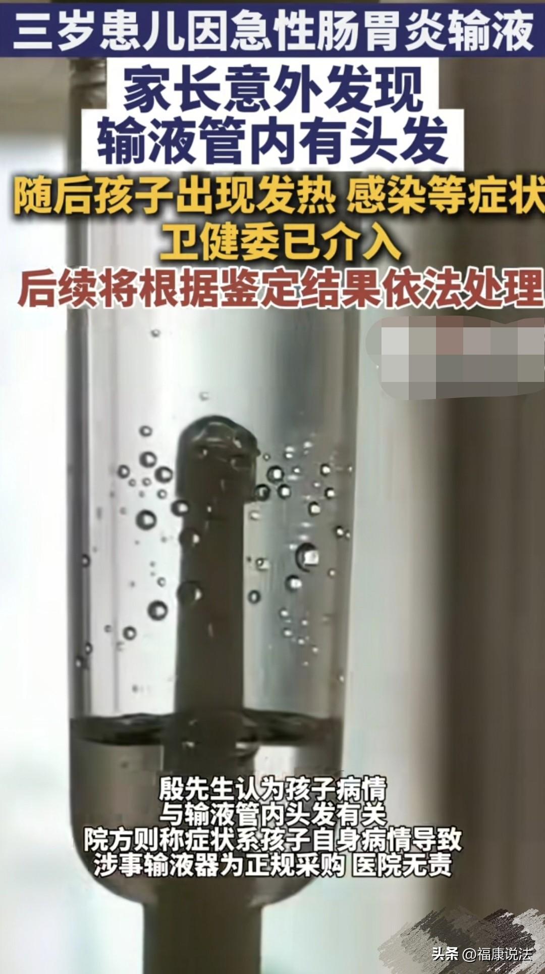 太吓人了!江苏南京,男子带3岁孩子在医院输液时,偶然发现输液管里有根头发,之后,孩子就有发热、感染症状了,男子认为就是头发导致的。可医院认为和头发无关,是孩子自己的病情导致加重的,让男子去起诉…… 3岁的小朋友因为肠胃炎去医院输液,这本来是个挺寻常的事,可接下来的画面却让家长惊出一身冷汗:输液管里竟然游荡着一根头发! 这事发生在南京,今年2月11号,殷先生家才3岁的小宝宝,因为急性肠胃炎去某医院儿科看病,医生安排了输液治疗。 本来孩子生病,殷先生就够揪心了,结果输液的时候,他一眼看见输液管里面居然藏着一根头发,还是在密封的管子里,当场就吓坏了。 更让人担心的是,发现头发之后没多久,孩子就开始发烧,还出现了感染的症状。 接下来几天孩子一直在医院治疗,检查结果显示,孩子达到了脓毒症的标准,还有严重代谢性酸中毒、急性肾损伤这些问题,情况挺危险的。 家长殷先生直接认为,孩子后面这些严重的症状,全都是输液管里的头发闹的,是医院用了不合格的器械,必须给说法、承担责任。 可医院这边说法完全不一样,院方说,孩子本来就是急性肠胃炎来的,后来的发烧、感染、肾损伤,都是孩子自己原本的病导致的,跟输液管里的头发没关系,医院没责任,还建议殷先生直接去法院起诉解决。 两边说不到一块儿去,后来经过调解也没谈拢。 于是,殷先生直接申请了司法鉴定,想弄明白医院到底有没有错,孩子的病跟这根带头发的输液管有没有关系。 医院这边也说了,涉事的输液器是正规渠道采购的,有合格证,医院不可能拆开每一个包装检查,真要是质量问题,责任该找生产厂家。 事发后医院已经封存了问题输液器,积极给孩子治疗,孩子住院期间也没花一分钱,身体状况良好,也治愈出院了,还按规定上报了不良事件。 目前,相关部门都已经介入跟踪这件事。 司法鉴定还在进行中,最终谁的责任,要等鉴定结果出来,再依法处理。 有人说,护士的三查七校是什么,有没有关于药品生产日期、无菌注射液、外观包装的检查? 也有人说,对药的时候,有可能会掉一点一点橡皮塞,这是正常现象。下面有过滤网,不可能进入血液的。这个很简单,直接把瓶子打开拿出来看看不就行了。 还有人说,把头发丝与相关人员做DNA做鉴定真象就会大白!是恶意碰瓷?还是医院或厂家责任? 这事儿摊在哪个家长身上都接受不了。三岁的小娃娃,本身就遭着肠胃炎的罪,家长眼睁睁看着输液管里飘着根头发,那种后怕和愤怒是完全能理解的。 头发虽然细,但出现在本该绝对无菌的输液管里,这就是严重的医疗安全事故。 站在客观的角度看,医院说自己是正规采购、肉眼难辨,这话在程序上可能站得住,但在情理上显得有点冷冰冰。 那么,孩子后来的发烧、肾损伤跟这根头发到底有没有直接关系,还得看最后的医疗鉴定,但在家长的认知里,孩子是输了这管带头发的水才病重的,这种心理冲击谁也消解不了。 从法律方面来说,只要在医院看病时因为医疗器械出问题导致身体损害,患者可以直接找医院要说法,也可以找厂家。 《民法典》第1203条规定:因产品存在缺陷造成他人损害的,被侵权人可以向产品的生产者请求赔偿,也可以向产品的销售者请求赔偿。 患者要求医院赔偿后,医院有权向负有责任的生产厂家追偿。 法律给了患者一个“二选一”的权利,目的是为了让受害者能最快拿到补偿,不用在医院和厂家之间被像皮球一样踢来踢去。 至于到底是厂家生产时掉进去了头发,还是医院进货检查没到?那是医院和厂家该去协商的事,不能让受害的家长和孩子等着他们扯皮。 医院现在的态度是“按规矩办”,建议家长起诉,这确实是解决纠纷的途径,但也容易让家属觉得医院在推卸责任。 医疗行业是个讲究精细和良心的行业,最后一道关卡没守住,哪怕是厂家的锅,医院也难辞其咎。 我觉得这事儿最公平的处理方式,就是让鉴定结论快点出来,到底是炎症引起的并发症,还是异物入血导致的感染,得有个明明白白的科学解释。