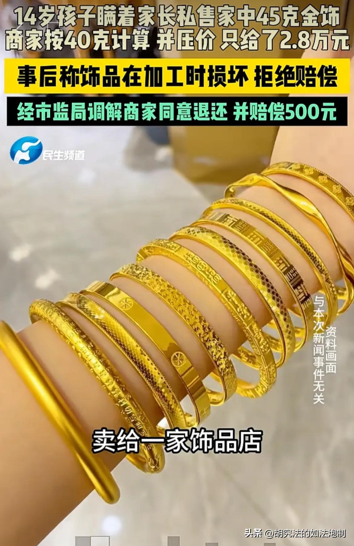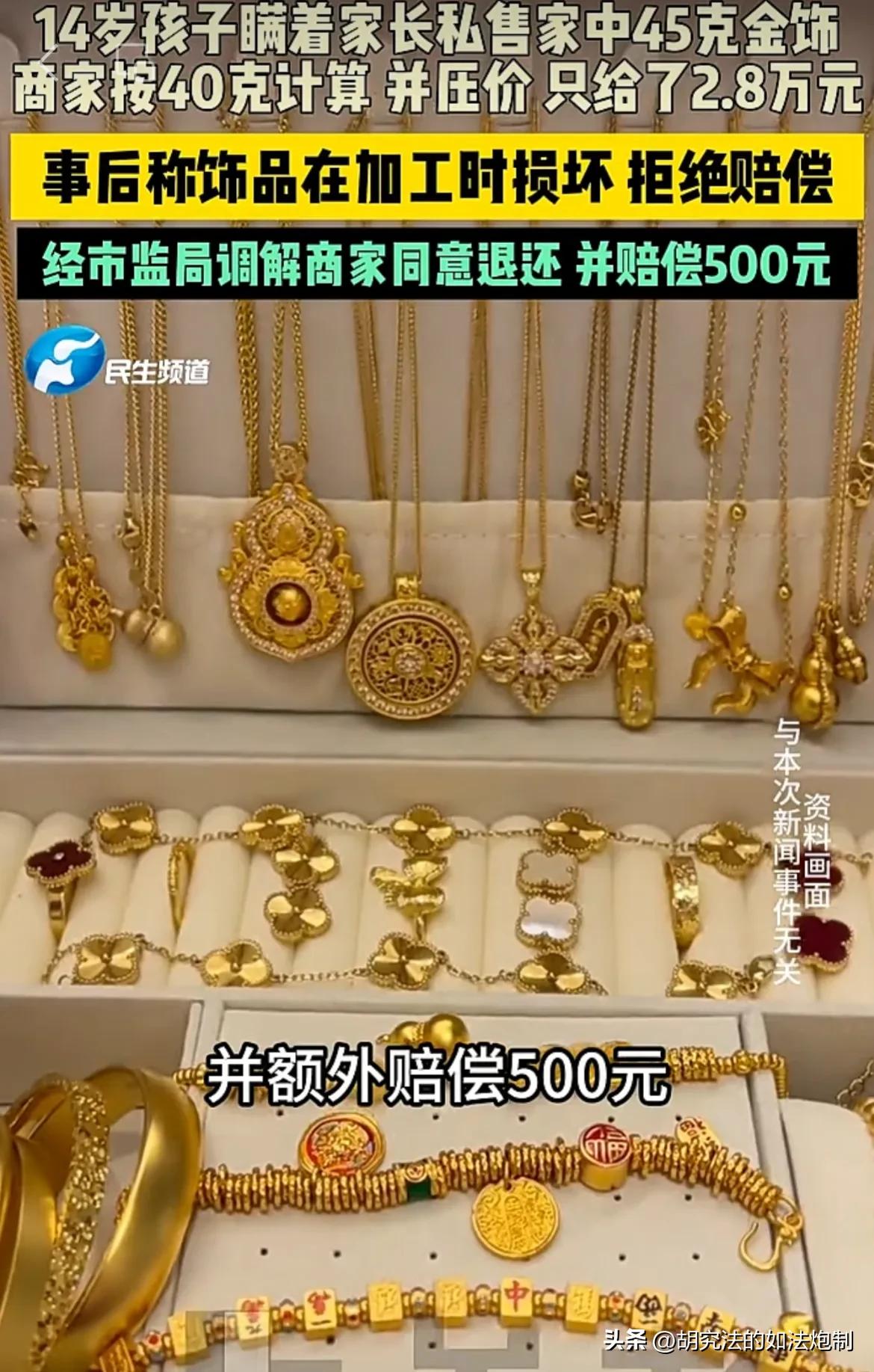 四川遂宁,一14岁孩子瞒着父母,把家里45克黄金首饰给卖了换零花钱。谁曾想,首饰店老板见其年龄不大,以低于市场回收价收购,并以40克进行计算,收购价为2.8万元。父母知道后,领着孩子上门维权。可商家却以“饰品损坏”为由拒绝赔偿。经有关部门调解后,商家退还饰品,并赔偿500元。 一个14岁孩子见身边的同学不是换了新手机就是买了新的游戏机,眼馋的不行。想让父母也给他买,可是父母又不同意。 可他没有新手机,平时上课的时候根本融入不到同学的圈子里,感觉自己被孤立了,孩子整天闷闷不乐。 为了能够筹集零花钱,孩子心里有了一个大胆的想法。他趁着父母不在家的时候偷偷溜进父母的卧室,本意是想找点零花钱,没想到却在床头柜里发现了一些金首饰。 孩子拿着这些金首饰陷入了沉思。 虽然他年龄不大,不过一些基本常识还是懂的。谁都知道金首饰能卖了换钱,再加上最近金价也很不错,这些金首饰一定能换一些钱。 孩子没有任何犹豫,把这些金首饰全部塞进了自己的兜。接着便慌忙的下了楼,随便就找了一家金首饰店,准备把这些首饰全部变现。 金首饰的老板见只有孩子一个人,却从兜里掏出来金手镯金项链等饰品,经过检验发现这些饰品全部都是真金。 再加上孩子一脸慌张的样子,老板心里自然明白是怎么回事,不过他并没有任何的声张。 老板告诉孩子,这些金首饰一共是40克,按照现在的回收价格,能卖2.8万。 孩子一听能卖2万多元,眼睛里满是震惊。2万多足够他买手机,足够他买游戏机了,这样他就能让其他的同学羡慕了,就不会再有人孤立他了。 孩子高高兴兴的拿着钱就走了,他不知道的是老板不仅缺斤短两,给他的价格远远低于市场的回收价。 孩子只知道,只要他有了这些钱,身边就不会缺朋友,更不会缺少同学们羡慕的目光。 可家里一下子丢失了如此贵重的物品,当父母的不可能不察觉。 当父母发现金首饰不见了,第一反应还以为是家里遭了贼。不过家中并没有任何被撬动的迹象,而且只有金首饰不见了其他的物品都没有丢失。 这个时候,孩子肯定心里紧张。父母随口一问,便把孩子吓得什么都说出来了。 得知是孩子把金首饰偷出去给卖了,父母被气坏了,差点没忍住,把孩子暴打一顿。 在得知孩子仅卖了2.8万元之后,当父母的更是绷不住了。 孩子不知道进价多少钱,当父母的可是知道。这个老板简直太没良心了,就连未成年人都坑。 父母于是带着孩子跑到金店维权,并要求老板赔偿。 没想到老板一点也不紧张,反而以金首饰已经被损坏为由,拒绝赔偿。 孩子父母气坏了,向有关部门进行投诉。后在有关部门的调解下,老板最终同意了退还损坏的金首饰,并赔偿孩子父母500元。 面对这样的结果,很多网友感到意难平。利用对方是未成年人,故意压低价格,还缺斤短两,最后却仅仅赔偿了500块钱,犯错的成本实在太低了。 《刑法》第266条规定故意缺斤少两,虚构重量或者纯度以骗取钱财的。数额较大可构成诈骗罪。 另外,第312条还规定,明知金饰是未成年人偷拿,仍以低价收购,可构成成本罪。 以当下黄金回收的价格,5克黄金绝对已经超过3000元了,完全满足立案的标准。 可商家仅被罚款500元,这样的处罚实在太轻了,怪不得不良商家会屡禁不止。 对此你怎么认为?