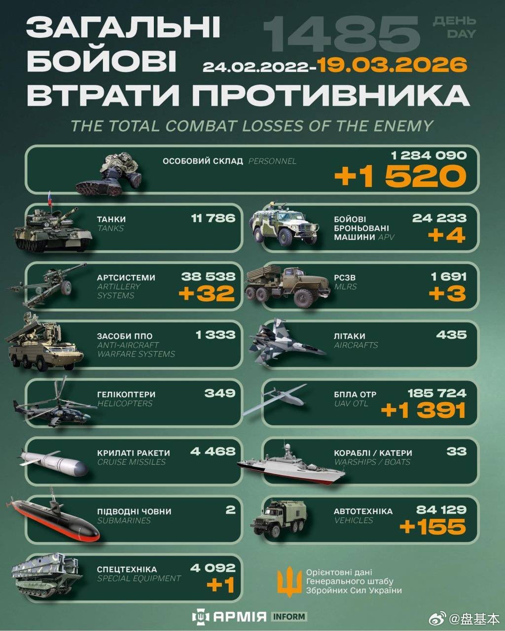约1284090头11786辆坦克24233辆装甲车38538门火炮1691门多管火箭炮1333套防空系统435架飞机 349架直升机185724架无人机4468枚导弹32艘军舰2艘潜艇84129辆汽车4092套特殊装备