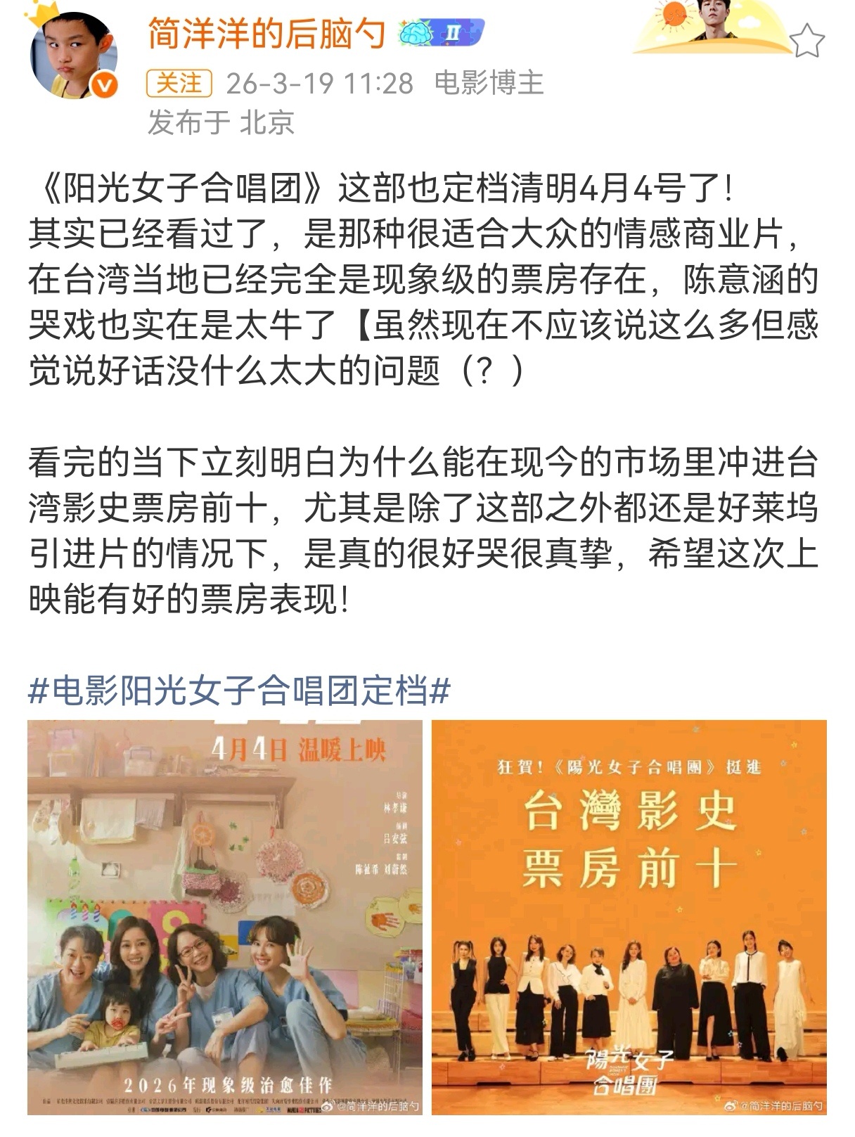 电影阳光女子合唱团定档阳光女子合唱团治愈感 电影《阳光女子合唱团》定档4月4日!作为中国台湾地区华语片影史票房冠军,它打破了尘封18年的票房纪录。导演林孝谦,编剧吕安弦《比悲伤更悲伤的故事》原班人马新作,谁懂当年在影院哭没整整一包纸巾的含金量!陈意涵领衔主演,一群不完美的她们在歌声里相互拥抱、与过往和解,看见阳光与希望,剧情真实又让人共情!已经做好大哭特哭的准备了,这次一定要带够纸巾!至少2包!!!
