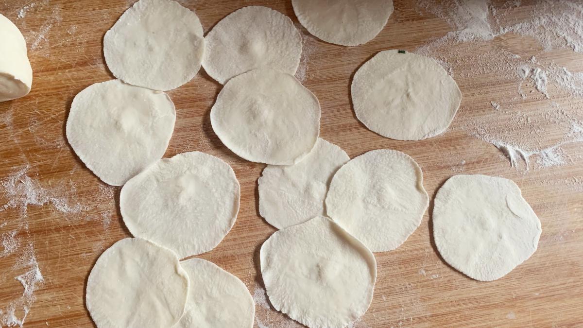 擀饺子皮也是个技术活,重要的是要把边缘擀薄,馅多皮薄才好吃。