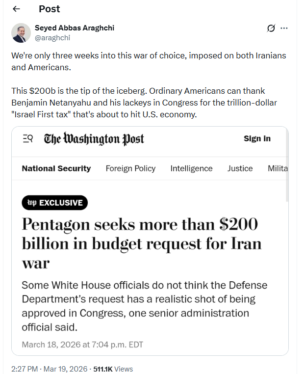 阿拉格齐当天在评论美国《华盛顿邮报》有关战事拨款申请的报道时说:“我们才刚进入这场加诸伊朗人和美国人的战争第三周。2000亿美元只是冰山一角。”