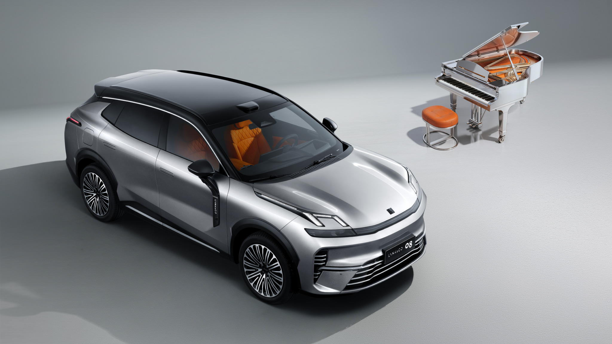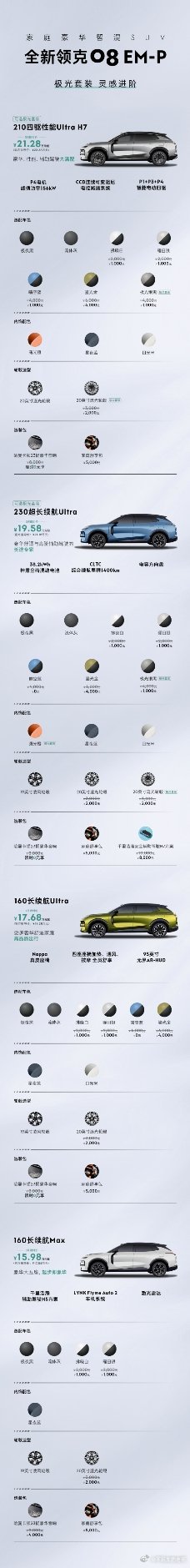 领克08极光套装灵感上新总结一下,是在08的210四驱性能Ultra H7、230超长续航Ultra车型上增加了选装套餐。主要改变:外观极光银黑,全新的20英寸流光轮毂,前格栅、车门外饰条、前后保险杠饰条以及侧窗饰条采用了哑光镀铬工艺。内饰是曙光橙色,用高级Nappa真皮包裹及Ansole抗污技术,依然是以30mm 10针的豪华缝纫工艺缝制坐垫与靠背。