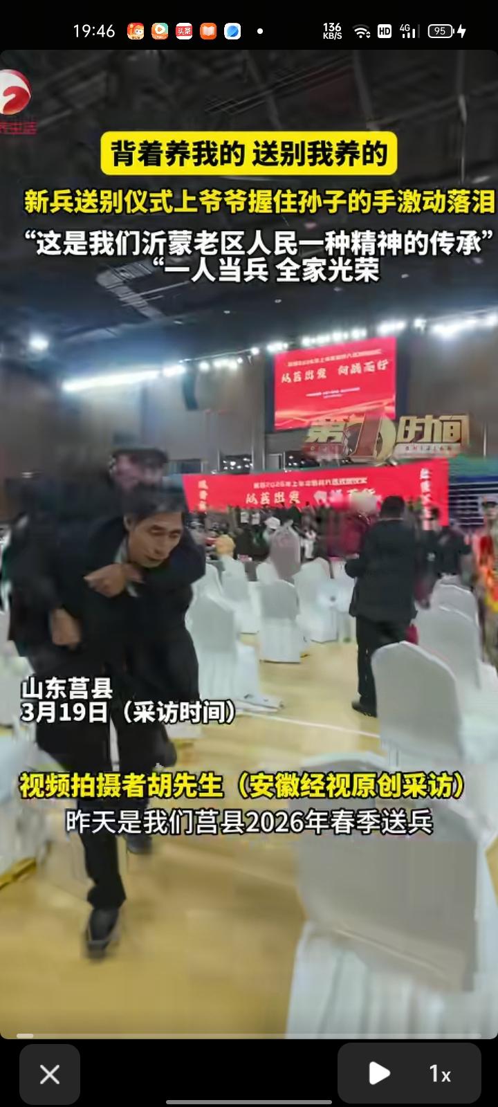 3月18日,日照市莒县。当地春季新兵送别仪式上,爷爷握住孙子的手激动落泪。 视频拍摄者胡先生称,仪式结束后安排家长和那个新同志见面,当时爷爷可能年纪大了,走路不是很方便,他爸爸就背着他这个爷爷跑着找孩子去。听着他父亲气喘吁吁的,见了孩子以后爷爷一直在那掉眼泪,是喜极而泣的那种。咱们农村孩子比较含蓄一点,可能不善于这种表达,这是沂蒙老区人民的一张精神传承,一人当兵,全家光荣。