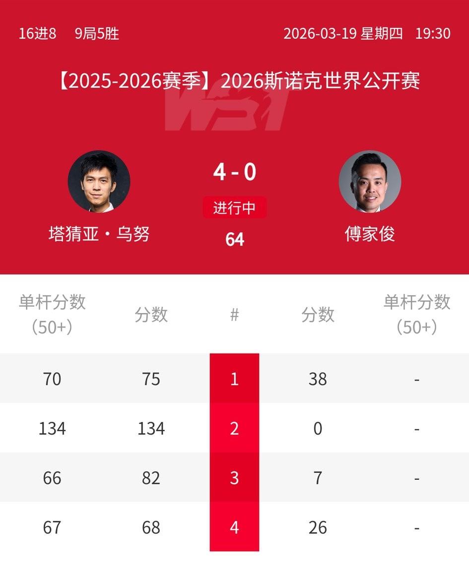 赵心童40分钟就打完了4局,特鲁姆普才刚刚打完两局。 今天赵公子的状态似乎不怎么好,半场结束,与咖喱2-2战平。 隔壁的傅家俊状态更差,半场结束竟然一局未胜,0-4落后塔猜亚。