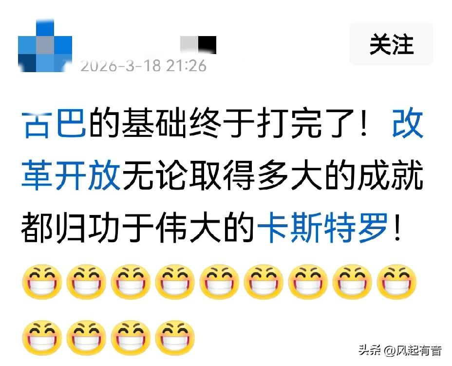 短短几句话,就将少数否定新中国前三十年的人的嘴脸暴露无遗。 有人发布了这么一段话:“古巴改革开放如果取得巨大成功,肯定有人会说:全靠卡太阳60多年来打下了雄厚基础。”这短短几十个字,却充斥着险恶与无耻。 首先,古巴今日的民生艰难、国家困顿是美国持续几十年的制裁造成的,与选择什么样的社会道路无关。古巴国小势弱,又没有什么矿产资源,近些年来以大力发展旅游业求得生存。当美国切断委内瑞拉的能源供给后,古巴连电力都无法保障,怎么能过上好日子?他们不分析事情根源,不谴责美国的霸权主义,还对古巴国家和人民遭受的苦难冷嘲热讽,充分暴露其信奉西方价值观、推崇美国的事实;充分说明他们只认准“美国永远正确”这一条,不会去探究事情根源,不会区分是非对错,丧失了基本的价值判断能力。 其次,以古巴“打基础”嘲讽新中国前三十年,用心险恶。“基础无用论”是前两年以“沈阳翁”为代表的历史虚无主义者为攻击、否定新中国前三十年而发明的一套说辞。经广大网友批驳后,“沈阳翁”已在网络上销声匿迹,但这套说辞却被其受众经常拿出来使用。 党的第三个历史决议已对新中国前三十年作出客观公正的评价,这里无需多论,但要提醒那些人思考一下,在我们真的有“打狗棍”的情况,美国及其附庸还经常来挑衅,如果没有“打狗棍”,会是什么情况?如果前三十年没有打破美西方制裁封锁,拿什么去开放?如果没有前三十年勒紧裤腰带建成的工业体系,改革开放能取得今日的成果吗(印度就是最好的例子)? 那段话一边在评论古巴,一边在否定新中国前三十年,说明那些打着支持改革开放旗号极力否定新中国前三十的人,信奉的是美西方价值观,反对的是社会主义制度,他们嘴里倡导的改革开放,其实是全盘西化,走西方道路。认清这一点,就不会被他们所忽悠了。