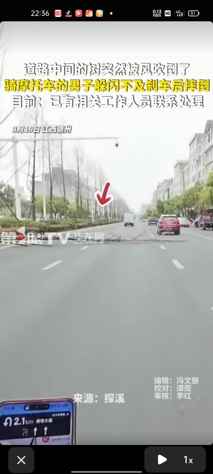 3月19日,赣州市兴国县。道路中间的树突然倒塌,骑摩托车的男子躲闪不及,刹车后摔倒。事后男子去医院给膝盖和脚踝拍个片,诊断出有一只脚可能有点骨折,目前已有相关工作人员联系处理