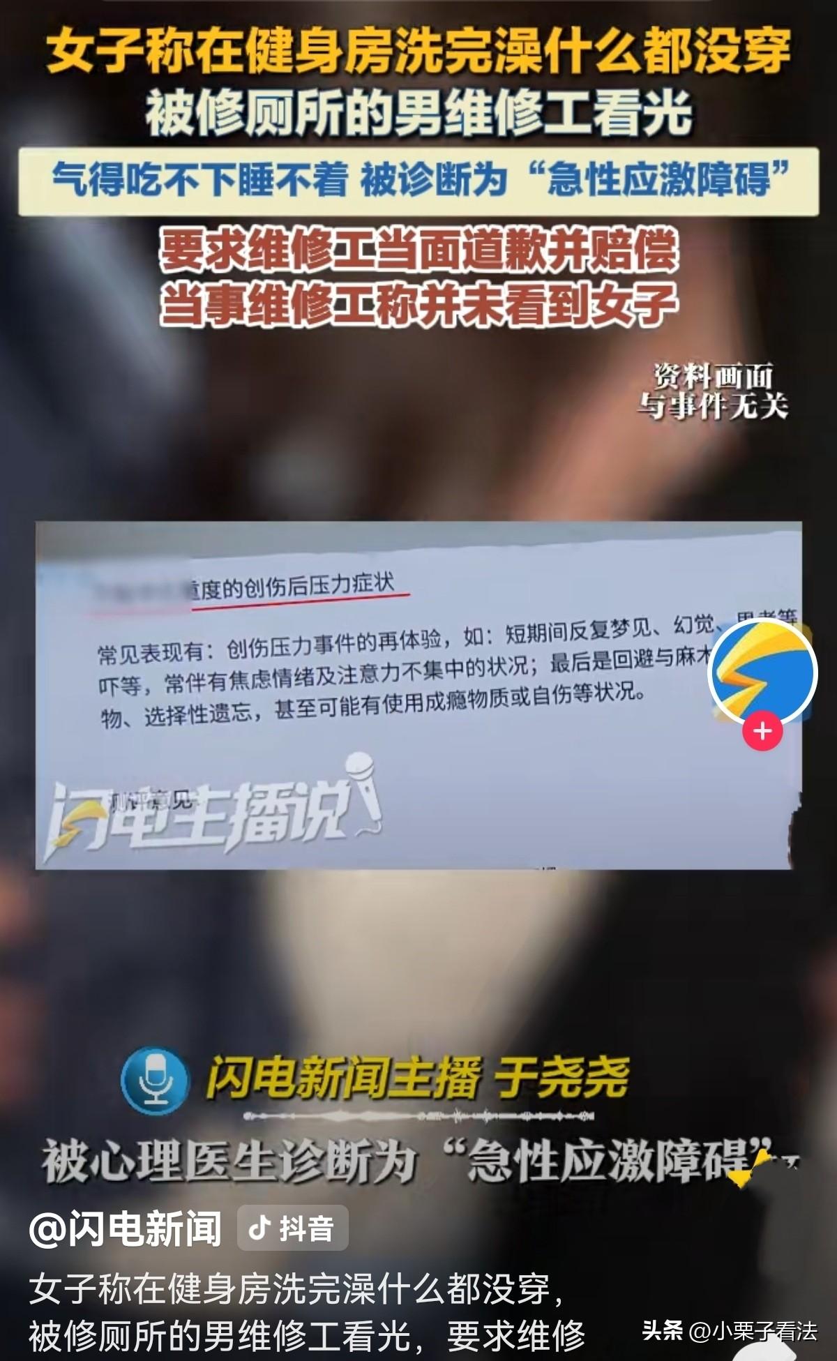 浙江嘉兴,一健身房里,女子健身完冲了个澡,没穿衣服从更衣室直接去女卫生间,竟然碰到一男维修工,被他看光。女子惊恐万状,回家想了一夜,次日就找健身房理论。店方表示:1980元的办卡费全额退还,或者是给她延长3个月的会员期额外送她一份礼物。女子通通不接受,双方谈崩了。她气得吃不香睡不着,去医院一检查,诊断为“急性应激障碍”。女子更是委屈,找到记者曝光此事,并要求一定要处理男维修工,并让他当面道歉并精神损失赔偿。维修工:保洁阿姨看着呢,我没看见!网友:就说要钱得了,别整那么多幺蛾子! 3月5日晚8点,正是健身中心的客流高峰。女更衣室里暖风轻吹,不少刚结束运动的女士正擦拭头发、整理衣物,一切都和往常一样放松自在。 周女士练完瑜伽后冲了个热水澡,浑身清爽,只想着快步走到隔壁女卫生间去方便下。 她赤身走出更衣隔间,脚步轻快,完全没意识到意外就正藏在几步之外的女厕里。 推开门的瞬间,周女士浑身血液仿佛瞬间凝固。一名身着黑色上衣、浅色系休闲裤的陌生男子,正手持工具站在卫生间内维修管道。 四目相对的刹那,她僵在原地无处躲藏,私密被一览无余。 羞耻与恐惧一起袭来,她才狼狈地退回更衣室,心脏狂跳不止。 事后她才得知,当晚女厕管道故障,这名男子是前来维修的工人。 可直到事发,没有任何工作人员提前广播通知、没有设置围挡警示、更没有引导顾客避开这片区域。 更衣室里仍有不少人悠闲吹着头发,对异性闯入私密区域一事浑然不觉。 当晚她彻夜未眠,眼前反复回放那尴尬又惊恐的一幕,羞耻感像潮水般将她淹没。 第二天一早,她来到健身中心讨要说法,满心期待能得到一句诚恳道歉与合理交代。 可店方的处理方式,让她的心彻底凉透。 工作人员给出两个方案:要么全额退还1980元办卡费用,要么延长3个月会员期并赠送一份礼品。 没有道歉,没有对管理疏漏的反思,更没有对她精神伤害的正视。 周女士当场拒绝,她要的不是退费与赠品,而是尊严与公道。 争执过后,周女士的状态持续恶化。她吃不下饭、睡不着觉,只要闭眼就会想起当晚的画面,焦虑与恐惧让她濒临崩溃。 在家人劝说下,她前往医院就诊,最终被诊断为急性应激障碍,需要专业心理干预与药物调理。 “我精神上受的伤,多少钱都补不回来。”她只有两个诉求:涉事男性工作人员当面口头道歉,以及承担相应的精神损害赔偿。 她将此事曝光,媒体介入。 面对媒体问询,健身中心的回应与周女士的描述完全相悖。 工作人员称,维修师傅自行去维修水管,跟保洁阿姨沟通后,让她帮忙看一下没人才进去的。 保洁陈述,她全程“看住”维修师傅的。直到维修师傅离开后,周女士才走出更衣室。 维修工也坚称自己并未看到周女士。 店方还解释,正常高峰时段不安排维修,此次是工人自行与保洁沟通,属于特例操作。 一方是确诊应激障碍的受害者,一方是坚称“未撞见”的经营方,真相在各执一词中变得模糊。这场隐私纠纷陷入僵局。 《民法典》第1198条规定:……娱乐场所等经营场所、公共场所的经营者、管理者或者群众性活动的组织者,未尽到安全保障义务,造成他人损害的,应当承担侵权责任。 因第三人的行为造成他人损害的,由第三人承担侵权责任……经营者、管理者或者组织者承担补充责任后,可以向第三人追偿。 律师指出,即便双方是否撞见存疑,健身房在未通知顾客、未封闭区域的情况下,擅自让男性维修工进入女宾私密区,已然未尽到安全保障与隐私保护义务。 让保洁阿姨看着维修工,可她怎么保证没有女顾客会出来上厕所呢? 经营场所对消费者负有法定隐私保护责任,因设施缺陷或管理疏漏导致隐私泄露,经营者需承担侵权责任,若造成严重精神损害,还应支付精神损害赔偿。 3月18日,记者以市民身份致电该健身中心,工作人员称,目前此事仍在解决,老板在负责沟通。 这场纠纷仍在僵持中。周女士依旧被心理创伤困扰,而健身中心仍在以“未撞见”为由,回避核心责任。 有人说,你一个去健身房的和一个干苦力的叫什么真啊?真觉得受委屈了,我表示同情,要不让他脱光也让你瞅一眼? 有人说,你认为在健身房受委屈那你找健身房,为难一个底层人干嘛?欺负人家势单力薄吗? 钱可以赔,道歉可以要,不过冤有头债有主,你不应该找维修工的麻烦,这种行为可以定义为欺软怕硬? 还有人说,钱没到位,不然不得气到吃不下睡不着。就想问问你,无意看见,你损失了什么?就是逮住一个使劲薅,巴不得把人家薅掉一层皮! 对此您怎么看?