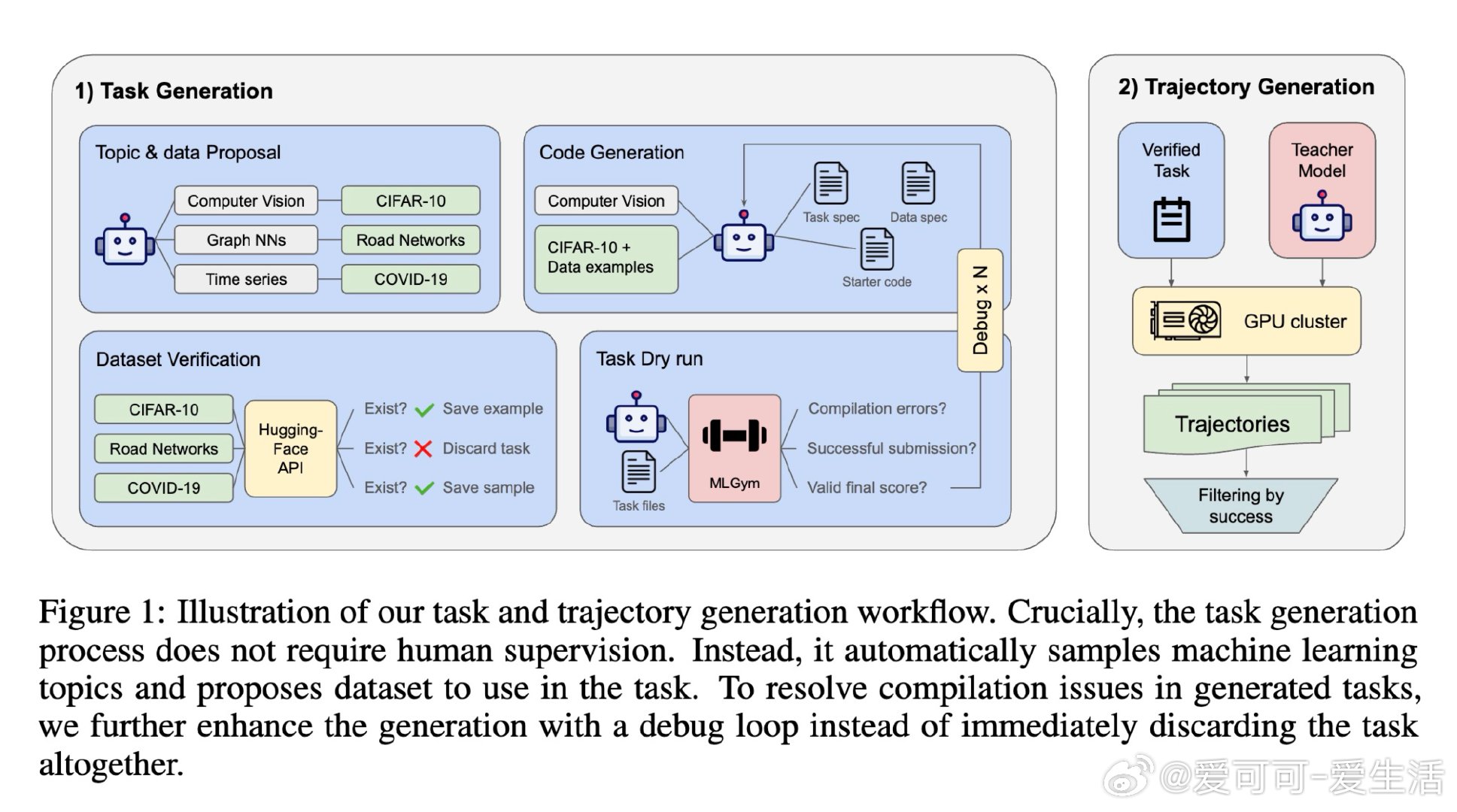 本文的核心洞见是:把"如何获得训练数据"这个问题,重新看作"如何自动制造训练环境"。以GPT-5为教师,全自动生成500个机器学习任务(从主题采样到HuggingFace数据集验证,再到可运行代码),用自调试循环淘汰破损任务,最终蒸馏出3万条真实操作轨迹。Qwen3-4B与8B在MLGym基准上分别提升9%和12%。