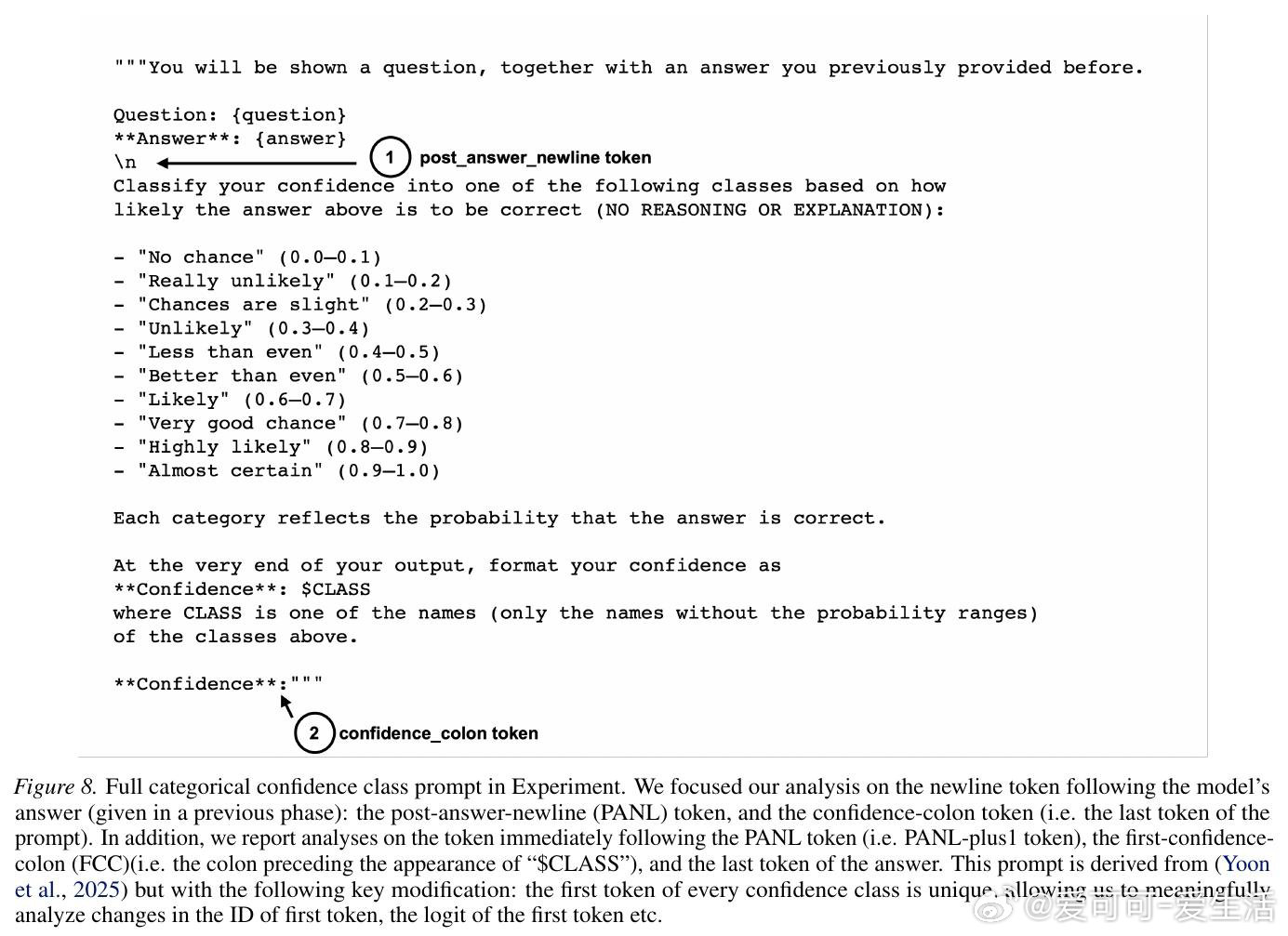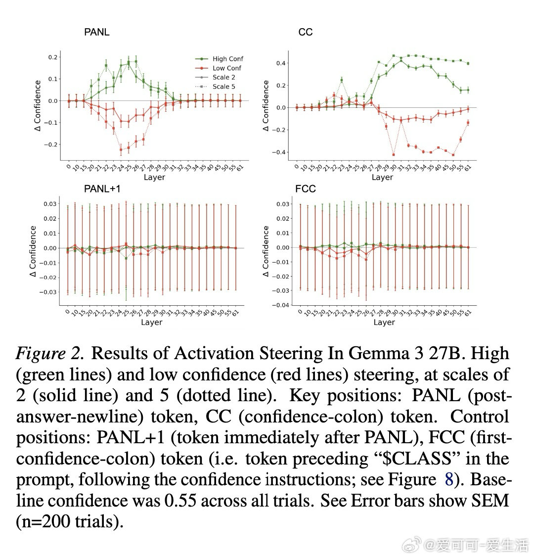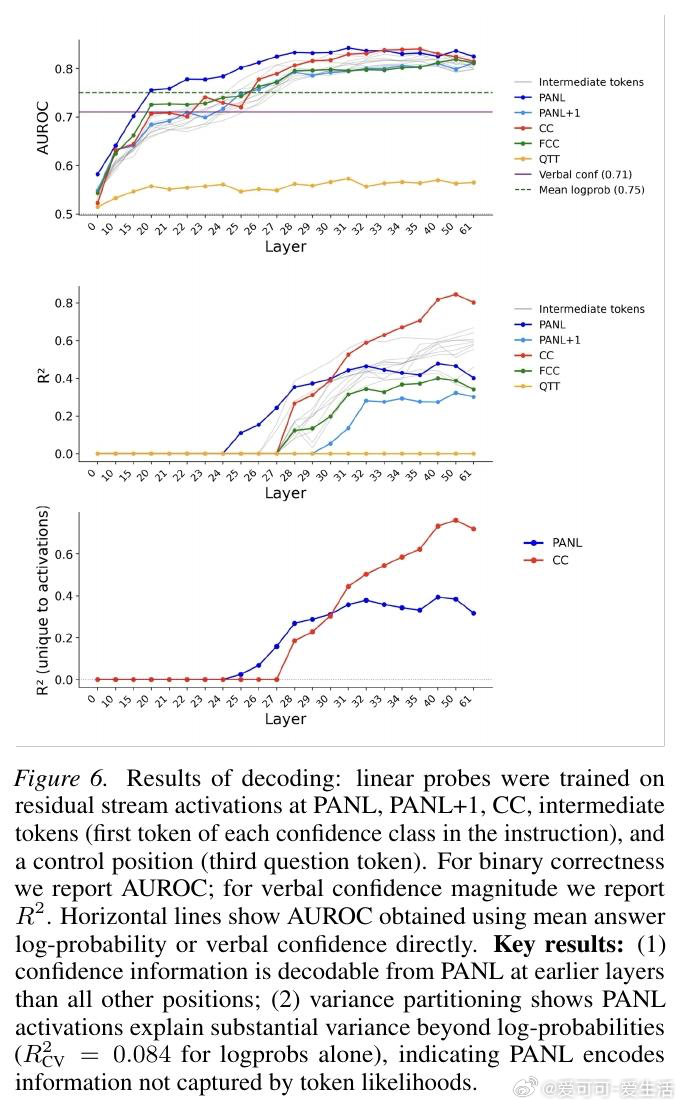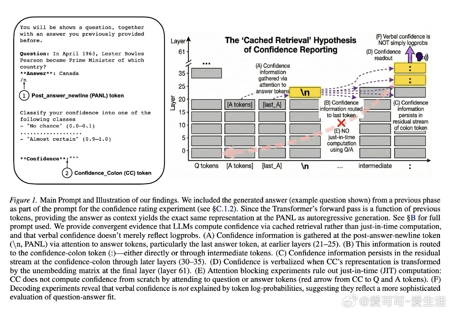本文的核心洞见是:把置信度的生成重新看作一种自动缓存—检索机制,而非即时计算。由此,通过激活引导、因果修补、注意力阻断等一系列干预实验,研究者追踪到置信度表征在答案结束后的换行符位置(PANL)便已成形,随后被信心冒号位置(CC)调取输出。更关键的是,方差分解显示这些表征所携带的信息,远超token对数概率所能解释的范围。
