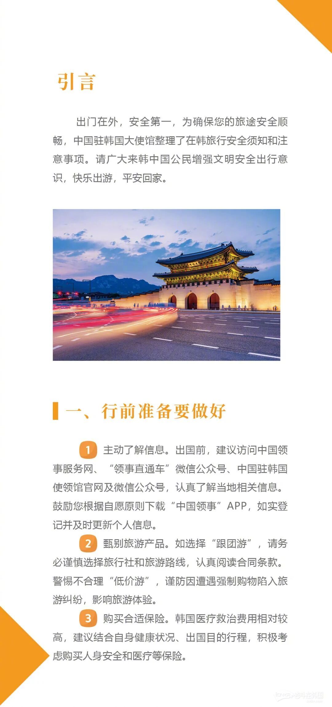 1.主动了解信息。出国前,建议访问中国领事服务网、“领事直通车”微信公众号、中国驻韩国使领馆官网及微信公众号,认真了解当地相关信息。鼓励您根据自愿原则下载“中国领事”APP,如实登记并及时更新个人信息。