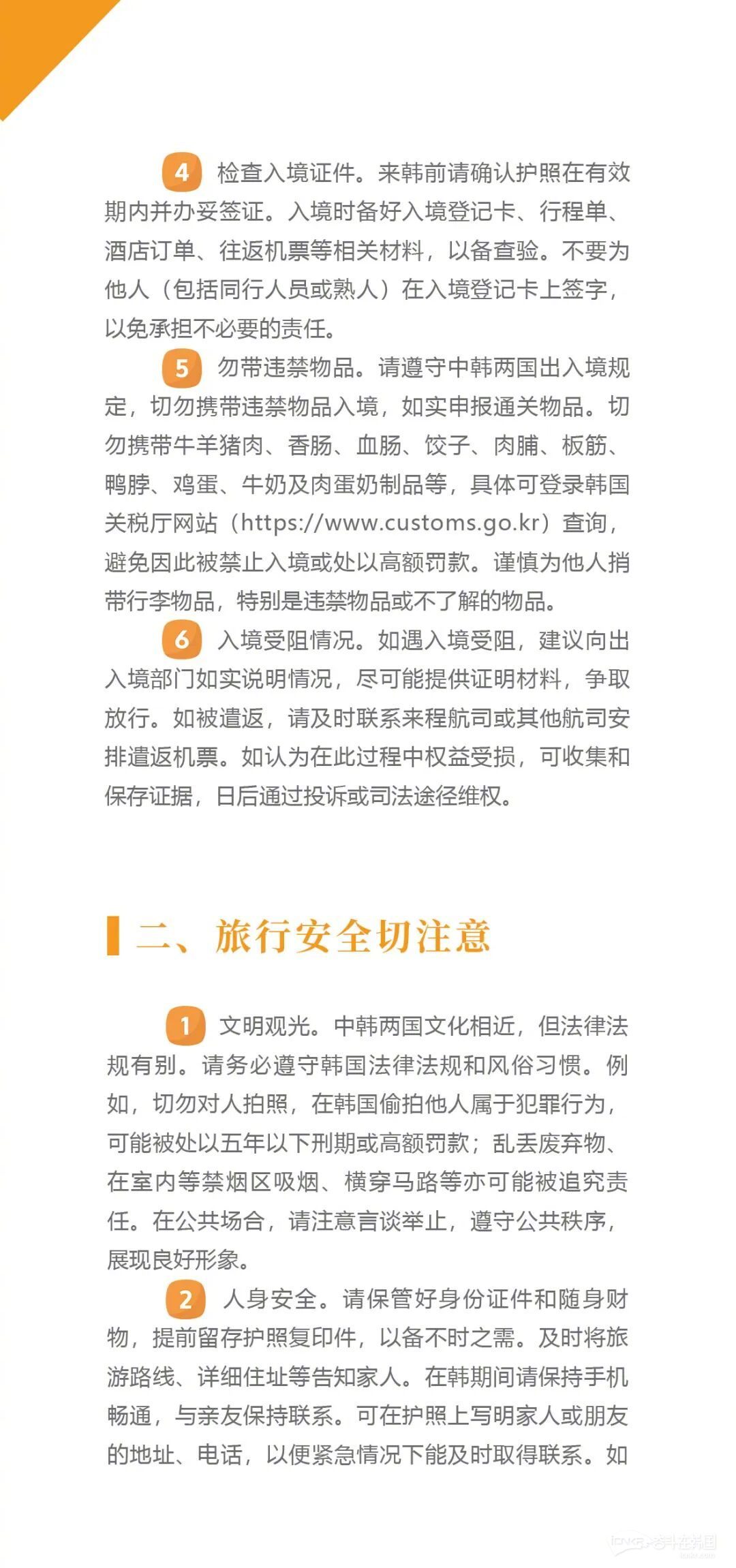 5.勿带违禁物品。请遵守中韩两国出入境规定,切勿携带违禁物品入境,如实申报通关物品。切勿携带牛羊猪肉、香肠、血肠、饺子、肉脯、板筋、鸭脖、鸡蛋、牛奶及肉蛋奶制品等,具体可登录韩国关税厅网站(网页链接)查询,避免因此被禁止入境或处以高额罚款。谨慎为他人捎带行李物品,特别是违禁物品或不了解的物品。