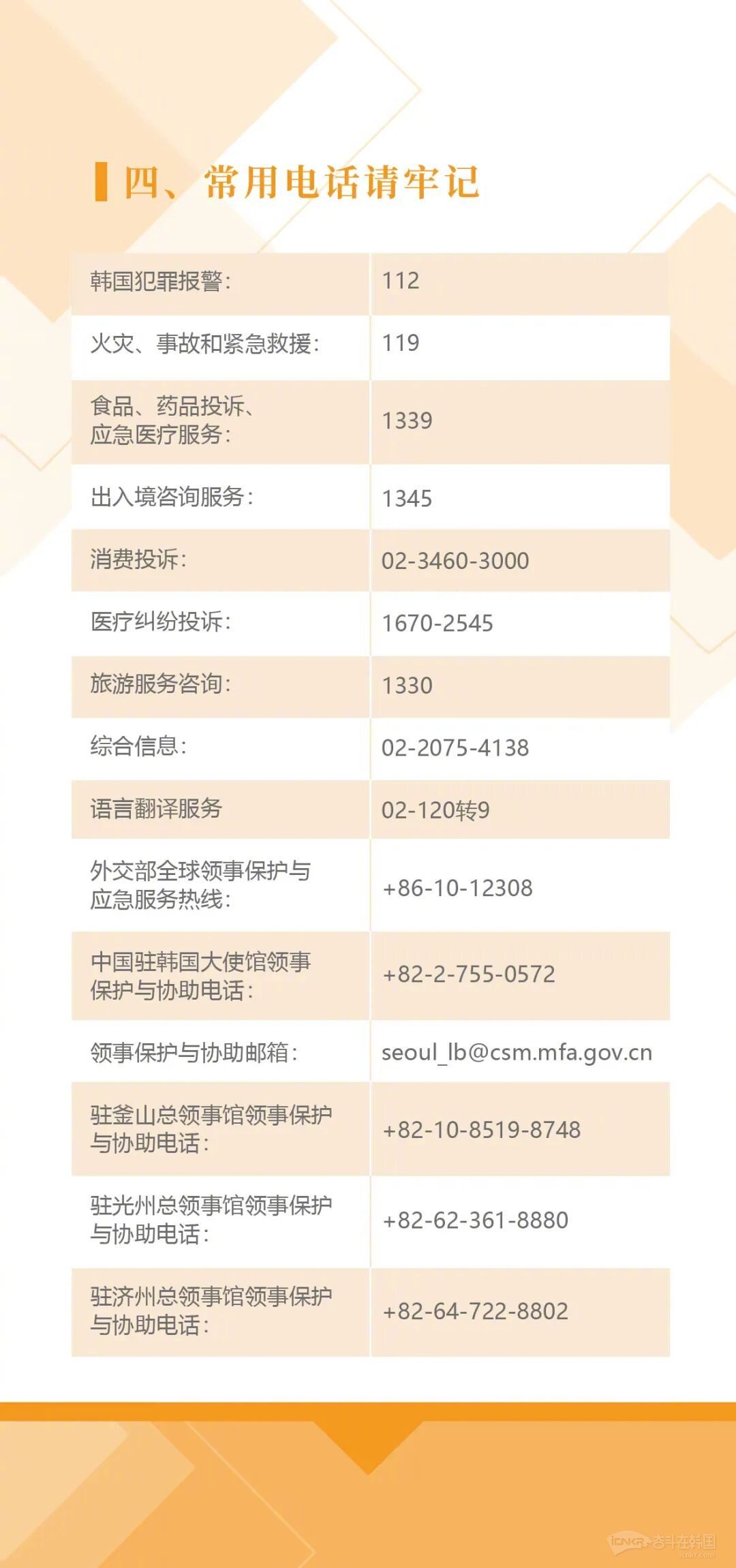 四、常用电话请牢记韩国犯罪报警:+82-112(有中文服务)火灾、事故和救援:+82-119应急医疗服务:+82-1339医疗纠纷投诉:+82-1670-2545出入境业务咨询:+82-2-1345消费投诉:+82-1372翻译服务:+82-2-120外交部全球领保与应急服务热线: +86-10-12308中国驻韩国大使馆领保电话: +82-2-755-0572中国驻韩国大使馆领保邮箱::seoul_Ib+82-51-7437989驻光州总领事馆领保电话: +82-62-361-8880驻济州总领事馆领保电话: +82-64-722-8802