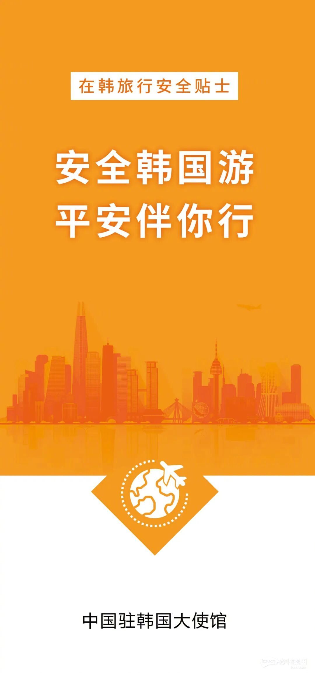 出门在外,安全第一,为确保您的旅途安全顺畅,中国驻韩国大使馆整理了在韩旅行安全须知和注意事项。请广大来韩中国公民增强文明安全出行意识,快乐出游,平安回家。