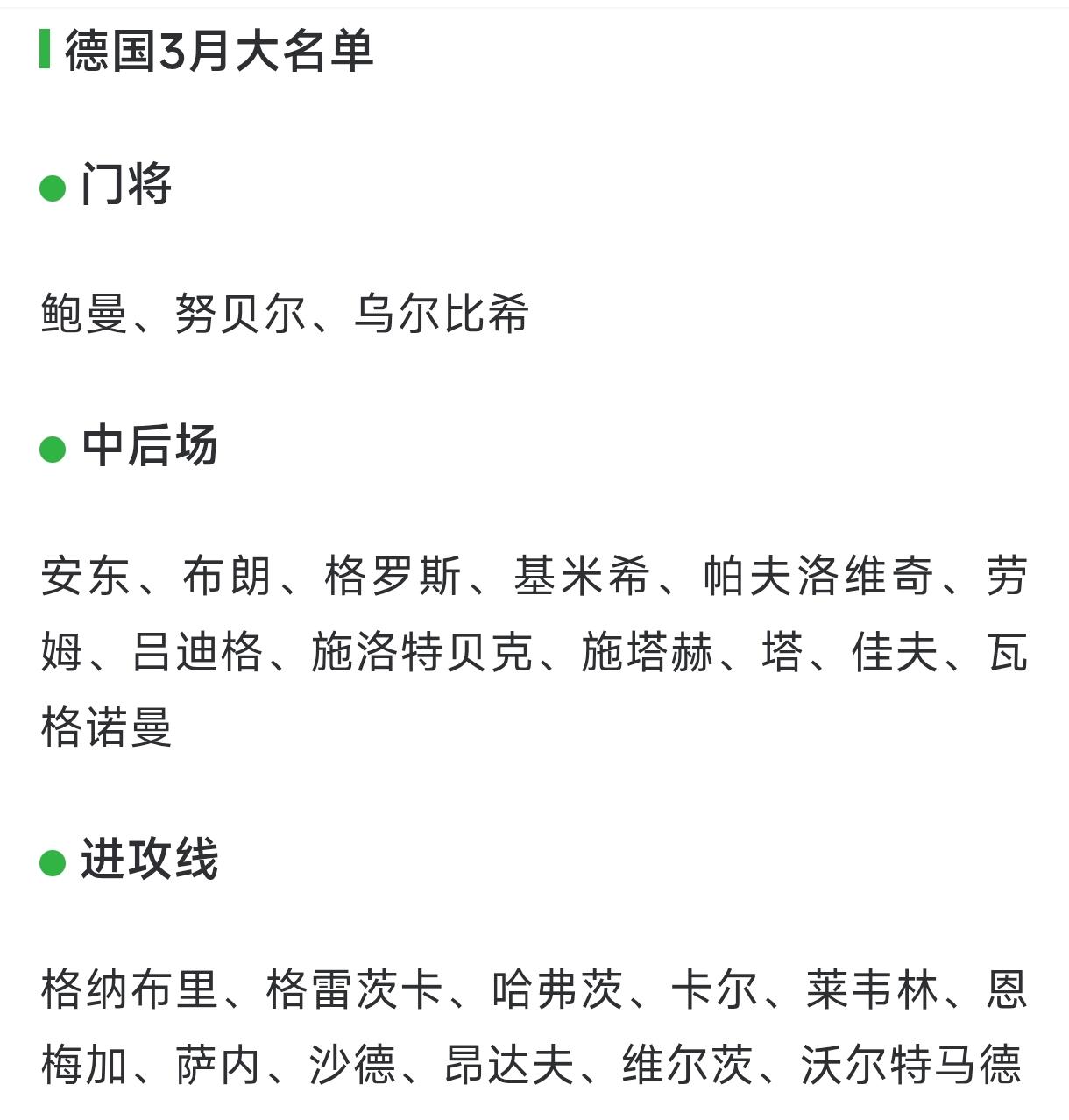 史上最差德国队来了,就这套阵容,世界杯小组能出线? 德国队最新大门将出炉! 门将位置,诺伊尔退休后,德国队向来赖以自豪的门将位置成了短板!鲍曼、努贝尔、乌尔比希,都是泛泛之辈,星光暗淡! 中后场,吕迪格、塔,一对粗人;劳姆、施洛特贝克也好不到哪去!就连纽卡斯尔的佳夫都入选了,真是灾难! 格罗斯、基米希、施塔赫,没有一个堪比巴尔韦德、赖斯、索博斯洛伊,就更别提佩德里、维蒂尼亚了! 进攻线,在利物浦找不到北的维尔茨,纽卡斯尔准备放弃的沃尔特马德,能指望上?格纳布里、格雷茨卡、哈弗茨之流,不堪大用! 这支德国队也没比国足强哪去啊!