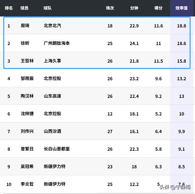 CBA国内球员十大中锋效率值排行榜(官方数据)如下: 第一名:周琦,场均11.6分,效率值18.8 第二名:徐昕,场均11分,效率值18.6 第三名:王哲林,场均11.5分,效率值15.8 余下分别是: 第四邹雨宸、第五陶汉林、第六沈梓捷、第七刘传兴、第八曾繁日、第九吴冠希、第十李炎哲 重要说明: 胡金秋场均16.6分,效率值19.2,妥妥的第一中锋无疑——但官方注册为大前锋。 总结如下: 1、周琦虽然排名暂时力压许昕,但领先极小,大魔王正在换代中——也许就在本赛季! 2、前十名中没有广东队焦泊乔和王少杰,所以广东队的主要问题真的不是徐杰和胡明轩后卫线! 3、中锋真的太容易受伤了,看看前十名的榜单,完好无缺的不多[捂脸]