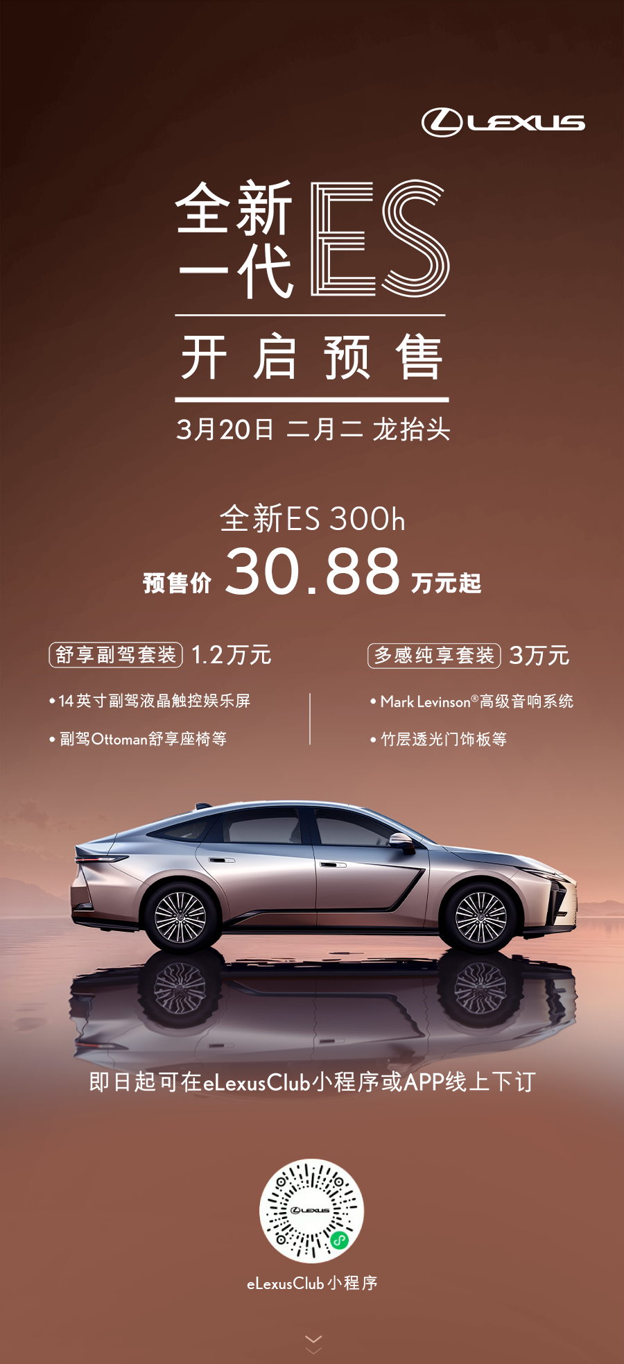 春风启新,雅致同行。今天,全新一代ES正式开启预售,全新ES 300h车型的预售价为30.88万元起,同时也为用户带来了丰富的跃级服务,以更从容、更细腻的体验,拓展豪华出行的新境。全新一代ES是一款“依然ES 超跃ES”的中大型豪华行政级轿车,将以美学、空间、舒享、智能、驾控全维跃级的产品定义和入门即高配的价值诚意,让“有温度的豪华”真正成为用户“阅尽千帆后的最终选择”。
