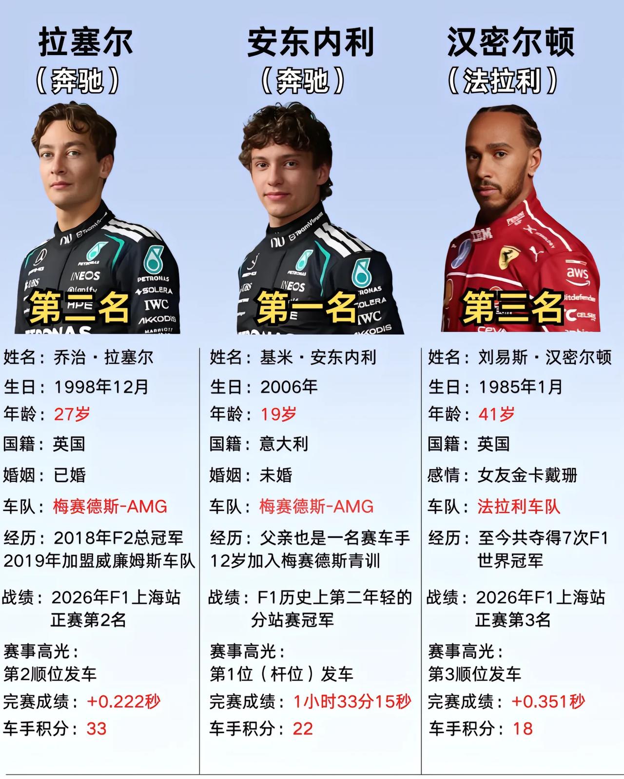 2026赛季F1中国大奖赛落幕,19岁安东内利斩获生涯首冠,梅赛德斯包揽冠亚军。
