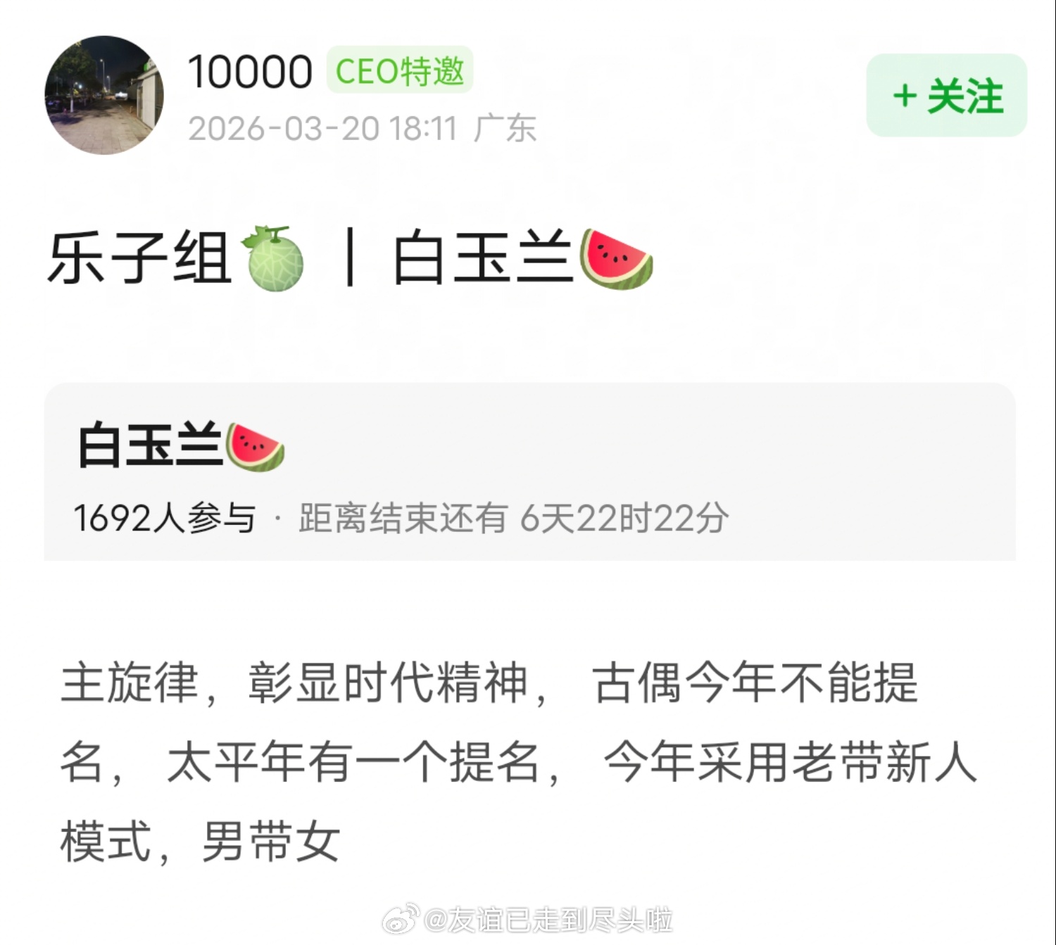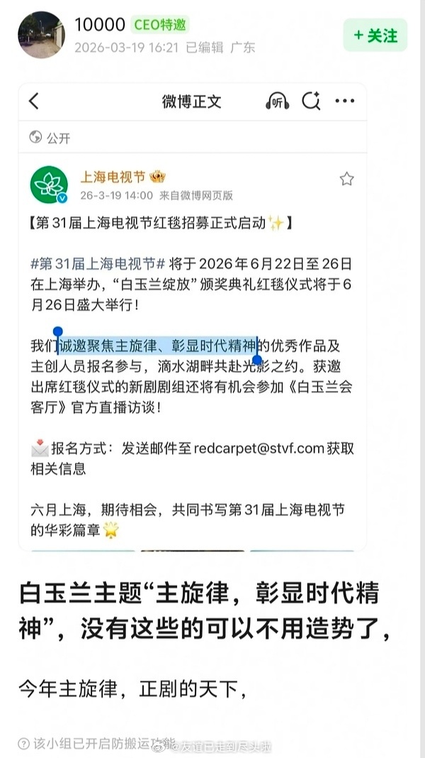 网友爆料今年白玉兰采用老带新模式,最佳女主角会给没拿过奖的新人。要求主旋律,彰显