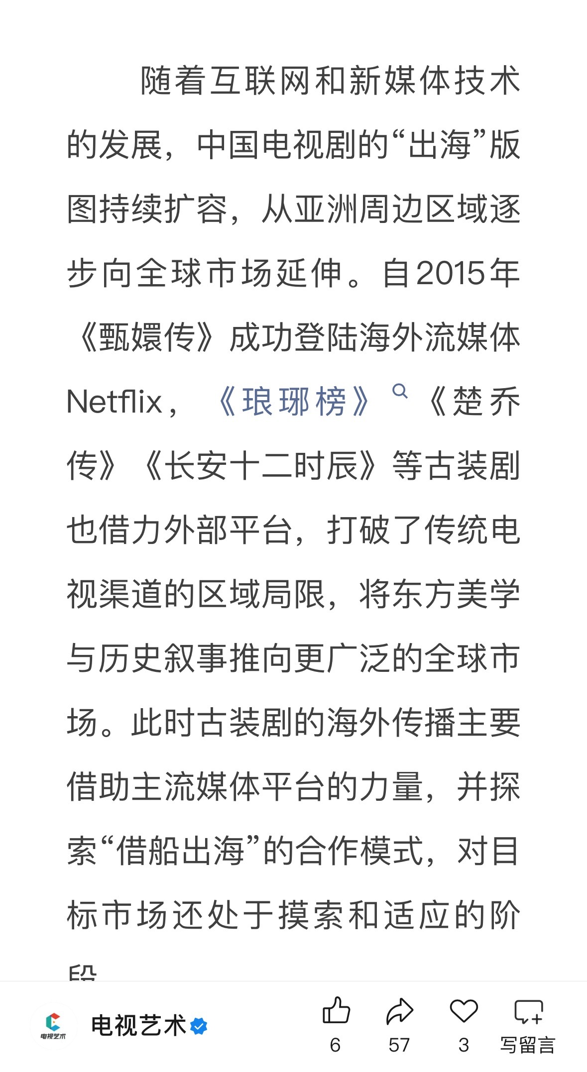 电视艺术报报道海外影响力大的古装剧🈶:1,孙俪《甄嬛传》2,胡歌《琅琊榜》3,赵丽颖《楚乔传》《知否知否》4,张若昀《庆余年》5,迪丽热巴《三生三世枕上书》6,鞠婧祎《漂亮书生》7,任嘉伦《大唐荣耀》8,肖战《藏海传》