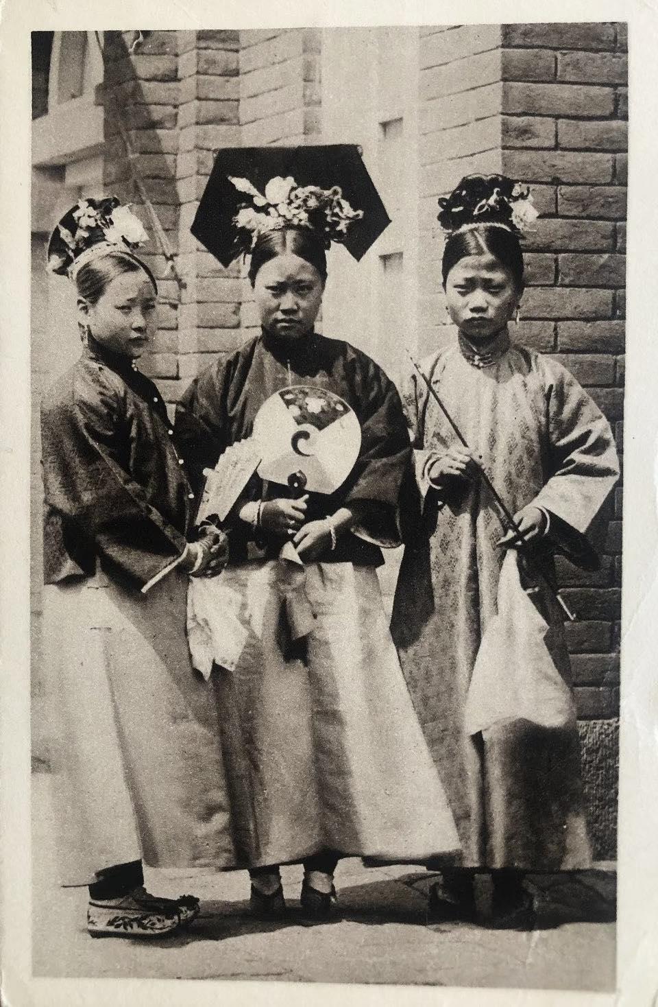 清末北京,三位满族旗人姑娘的合影。 中间那位戴着夸张的大拉翅旗头,是典型的满族已婚妇人装扮;左右两位梳着传统发髻,朴素却精致。
