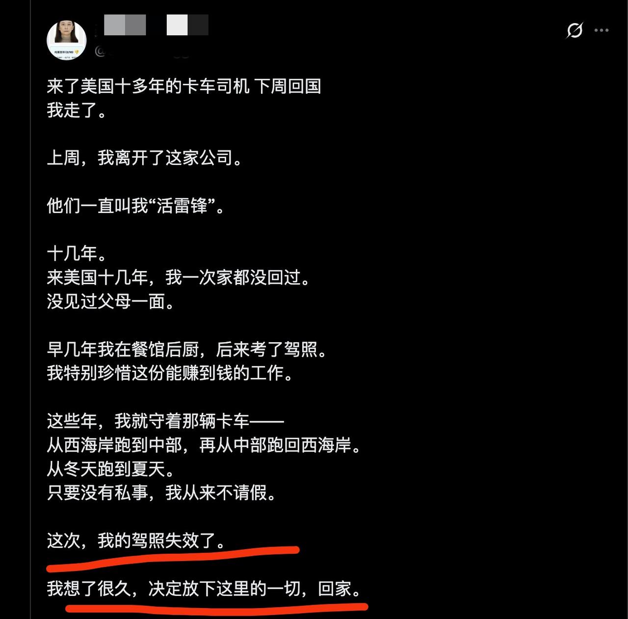 润人在美国的卡车驾照到期不给续了, 说被迫要回国了,走时还不忘跪舔川普: 不管怎么骂川普,他造福人类是真的。 据了解, 卡车司机是美国华人高度集中的职业, 在川普的铁拳下新增了很多门槛, 导致很多华人司机没有办法更新驾照, 丢了饭碗。 这个在美国待了十几年的川粉, 也不例外。 但是即便要被迫回国了, 他依然不忘记给自己的教主打气加油。 作为全聚德的鸭子, 挂进烤炉都还在为全聚德自豪。 认知配上了命运, 合拍。
