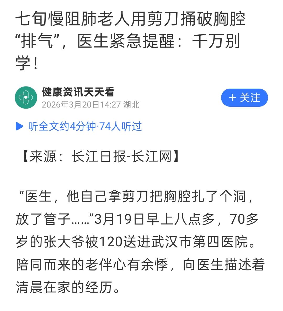 这位大爷的确是个狠人,用剪刀给自己“开膛破肚”,医生紧急提醒:千万别学! 一位七十多岁的慢阻肺老人,喘不上气,实在受不了了,拿剪刀捅进自己胸口,给自己“放气”。这惊悚的一幕并非电影情节,而是真实发生的悲剧。 很多网友看完都吓出一身冷汗,但这背后其实是老人“实在喘不上气”的绝望自救。 估计你的第一反应也应该是惊呼:疯了?不要命了? 可你知道他为什么要这么做吗?因为慢阻肺并发气胸的时候,肺被压得死死的,吸不进气、躺不下来、话都说不出,那种“被活活憋死”的感觉,比刀割还难受。 老人家是实在熬不住了,才想出这个“土法子”,他以为只要把气放出来,就能喘上那一口气。 说实话,看完这事儿我一点都不想骂他“无知”。我只觉得心酸。 可以想象,大爷当时有多么绝望,如果有更好的办法缓解症状,谁会拿剪刀往自己身上扎?所以,大爷不是勇敢,而是被逼到了绝路上。 但话说回来,这一剪刀下去,命大没伤到心脏、没大出血,已经烧高香了。万一扎错了地方,连到医院的机会都没有。 我理解老人的绝望,但我更心疼的是——咱们老人的“急救常识”,怎么还是停留在这种“自己动手”的阶段? 别再让老人一个人硬扛了。家里有慢阻肺、老肺病的,平时多问问、多看着点。真出事了,别犹豫,打120比啥都强。 这世界没有哪个病,是值得拿命去试的。