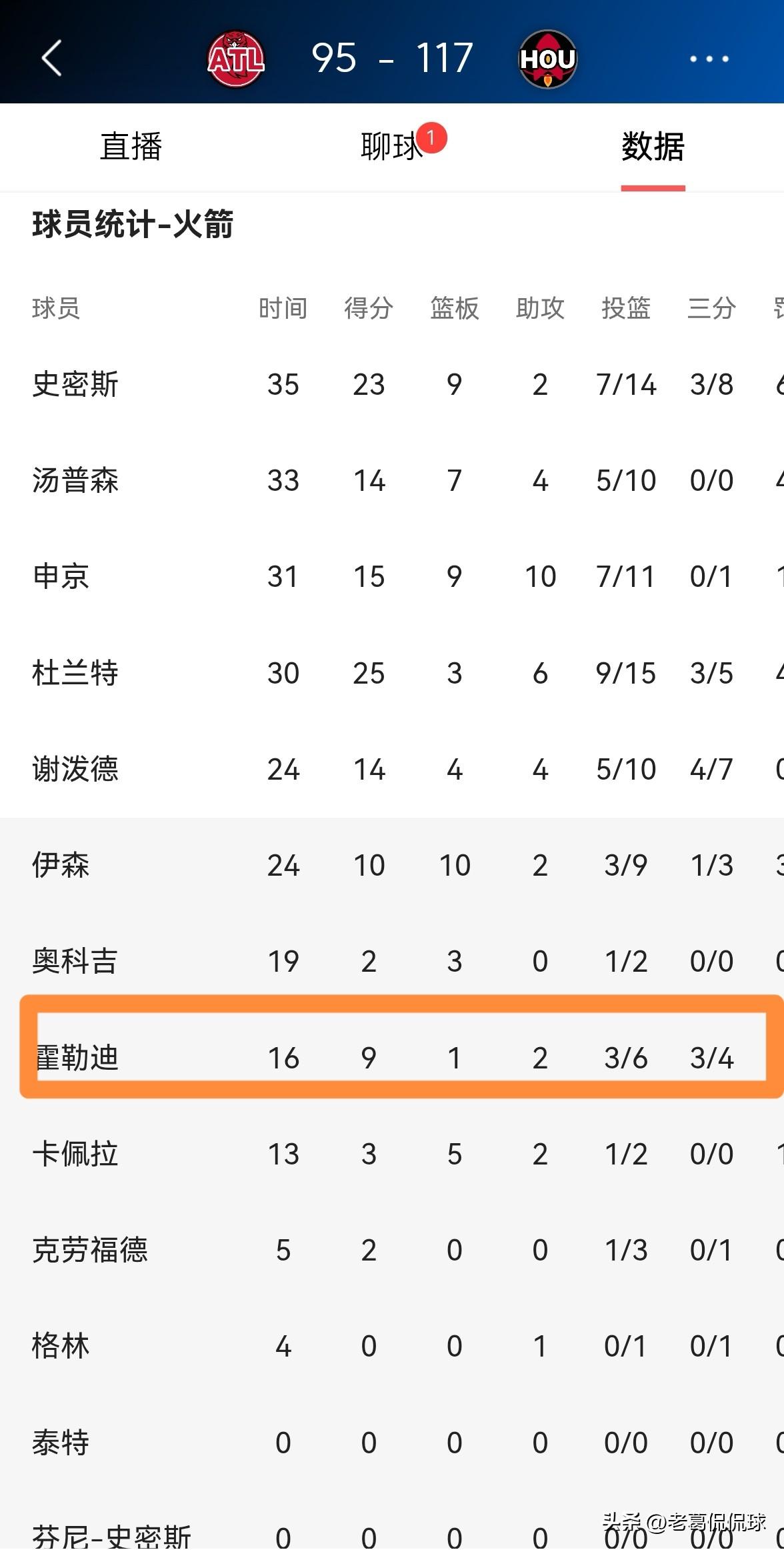 火箭大将霍勒迪真是太出彩了!在今天火箭主场以117:95击败老鹰的比赛中,霍勒迪