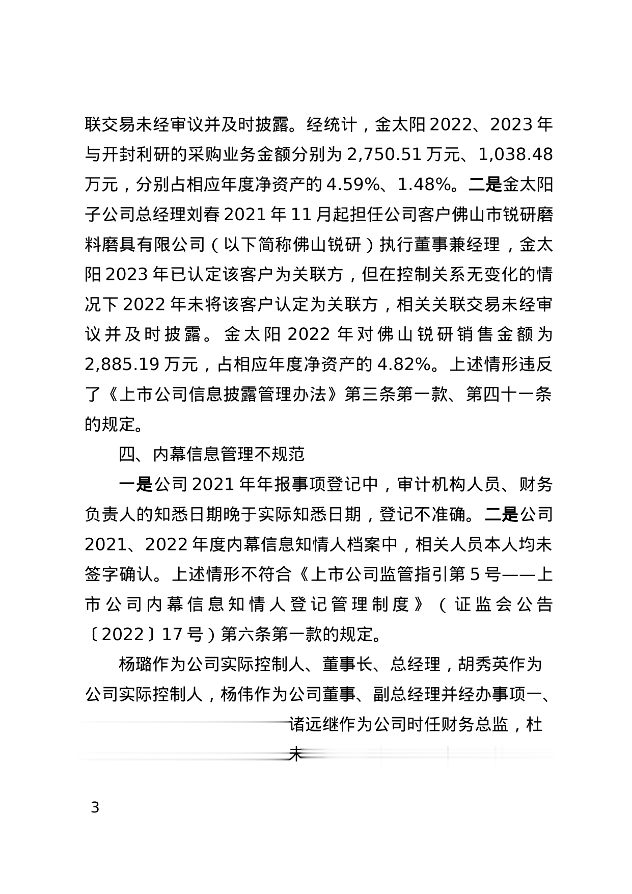 决定书显示,东莞金太阳研磨股份有限公司存在以下问题:应收账款核算不准确,坏账计提不充分;实际控制人非经营性资金占用;部分关联交易未及时审议披露;内幕信息管理不规范。