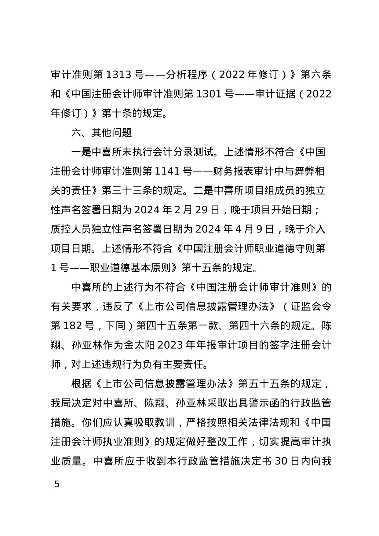 上述行为不符合《中国注册会计师审计准则》的有关要求,违反了《上市公司信息披露管理办法》的规定。陈翔和孙亚林作为金太阳2023年年报审计项目的签字注册会计师,对上述违规行为负有主要责任。