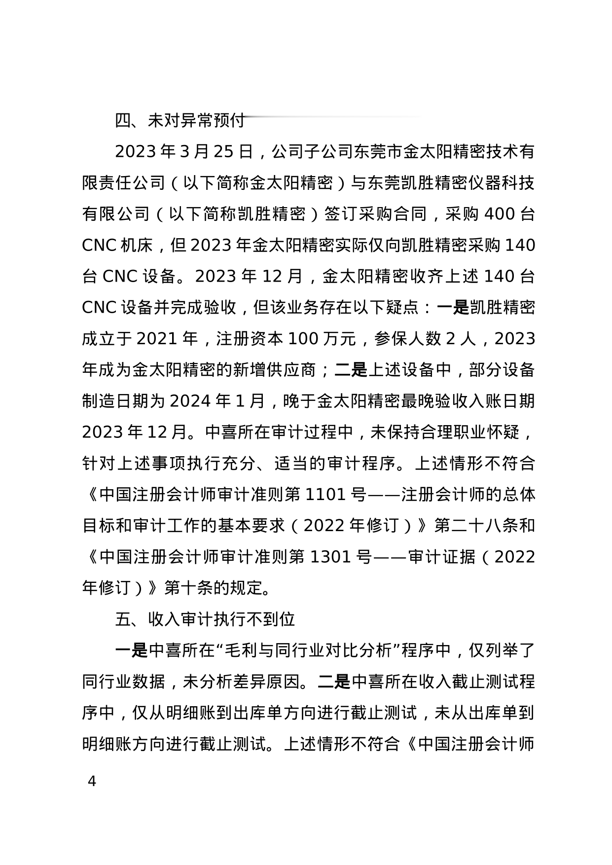 决定书显示,中喜会计师事务所(特殊普通合伙)在对东莞金太阳研磨股份有限公司2023年年报审计工作中存在多项问题。包括风险评估程序执行不充分、控制测试程序执行不到位、函证程序执行不到位、未对异常预付款项保持合理职业怀疑、收入审计执行不到位以及其他问题,如未执行会计分录测试和独立性声明签署日期晚于规定时间。