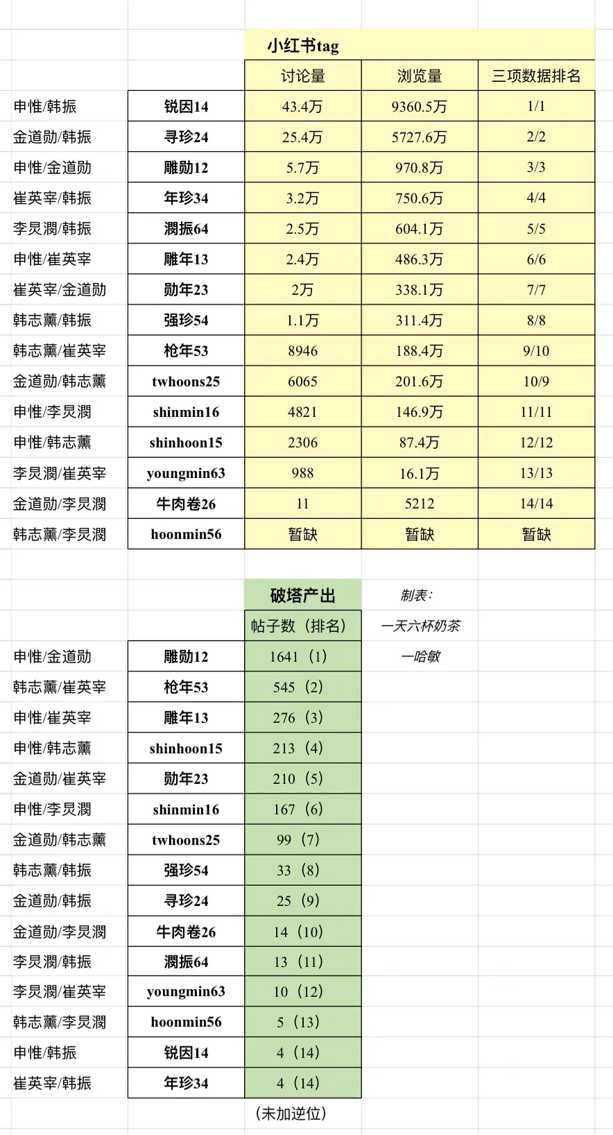 TWS队内CP全平台数据拉表申惟/金道勋/崔英宰/韩振/韩志薰/李炅潣