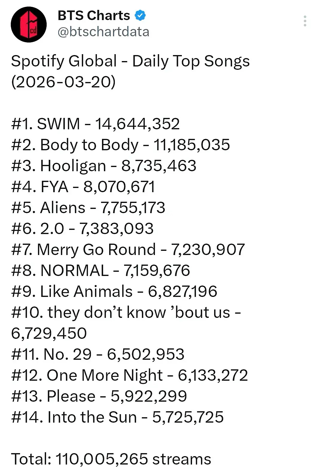 BTS防弹少年团本次回归全球Spotify日榜全专破亿单曲空降洗榜前14
