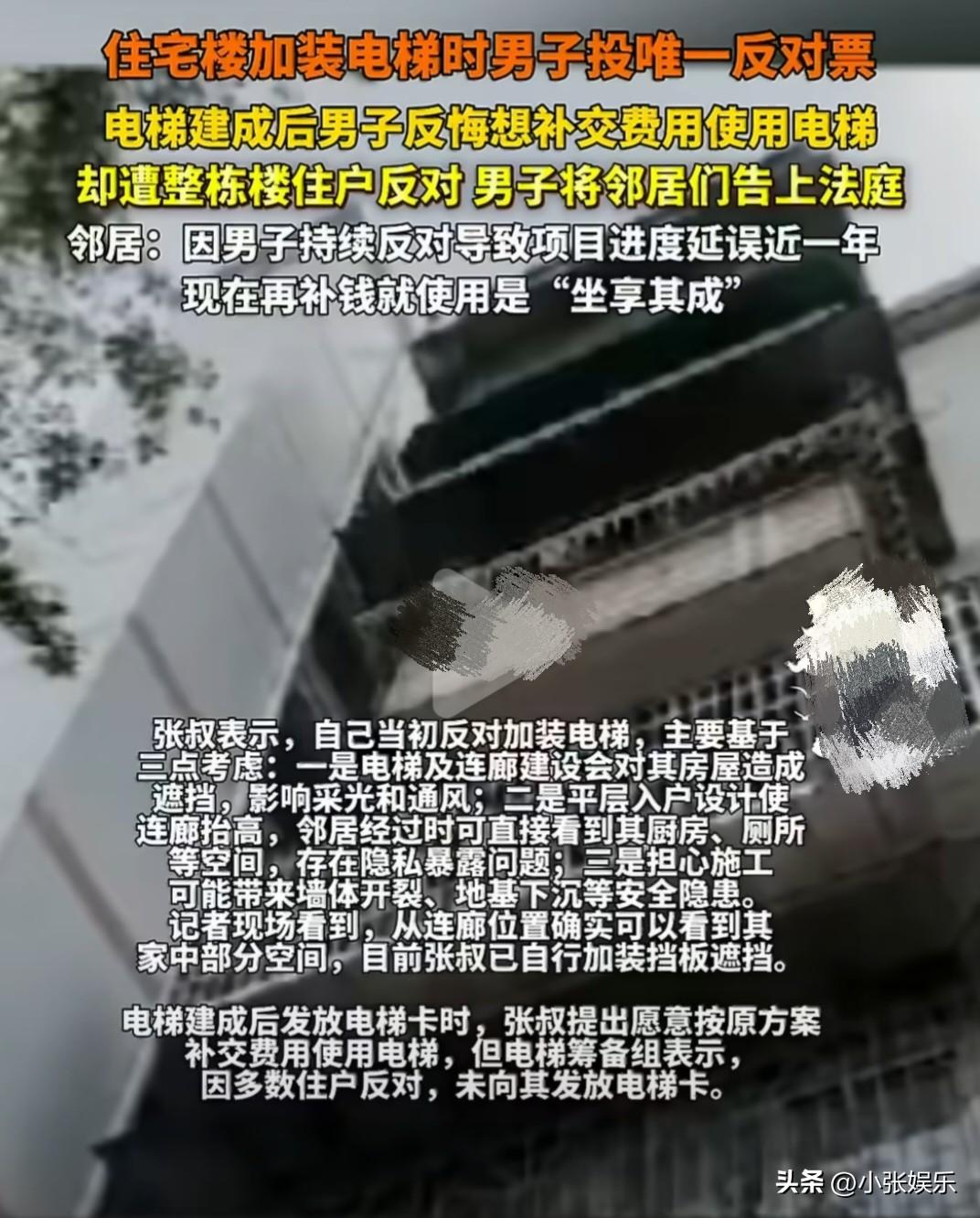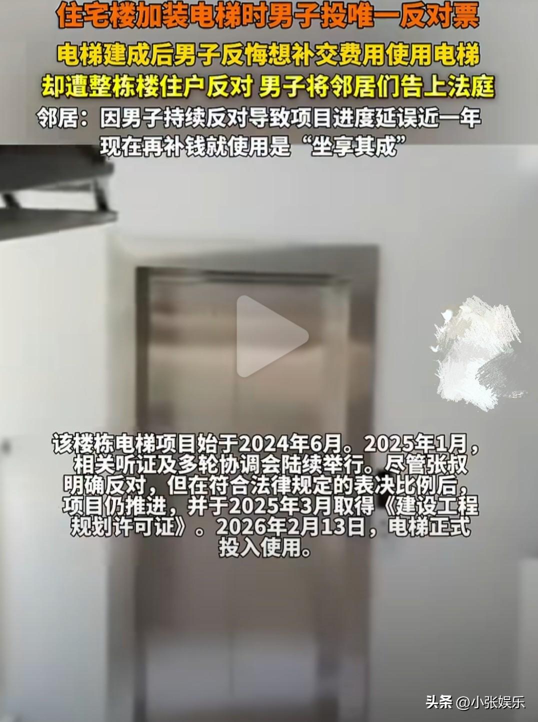 “不值得同情”广州白云区一栋40年楼龄的老楼,加装电梯时他投了唯一反对票, 电梯建成后却想补交1.9万费用用电梯,没想到被全楼邻居拒绝,男子直接把十余名邻居告上法庭。 这栋楼的电梯项目2024年6月就开始弄了,中间开了好多听证会、协调会。 该男子一直明确反对,但架不住符合法定表决比例,项目还是2025年3月拿到了规划许可证,今年2月13日正式投入使用。 现在,该男子解释说,自己反对是有原因的:一是电梯和连廊会挡他家光、影响通风; 二是平层入户的连廊太高,邻居路过能直接看到他家厨房、厕所,隐私没了; 三是担心施工把墙体弄裂、地基弄沉。 记者去现场看了,从连廊确实能看到他家部分空间,现在他自己装了挡板挡着。 结果电梯建好了发电梯卡,他说愿意按原方案补交费用用电梯,电梯筹备组却因为多数住户反对,没给他发卡。 为什么一直不给男子发卡呢?原来是该男子在加装过程中一直反对,导致项目反复协调,进度耽误了近一年,大家没少花时间精力。 现在他补点钱就想用,这不就是坐享其成吗?而且他都起诉全体业主了,矛盾更激化了。 部分住户表示,要是他撤诉,还能再商量商量用电梯的事。但估计很难。 目前案子白云区法院已经受理了,还没判。属地街道办说已经组织好几次调解了,后面会继续推动双方沟通,尽量把这事解决好。 你觉得张叔该不该补交费用后使用电梯?邻居们的反对有道理吗?